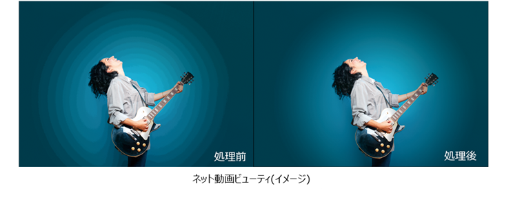 また、ネット動画の特性に合わせて高画質処理することにより、コントラスト・精細感をアップさせ、低フレームレートコンテンツもなめらかに再生します。さらに、YouTubeなどの高圧縮コンテンツで発生しがちな圧縮ノイズやバンディングを抑制。なめらかで自然な高画質を実現します。