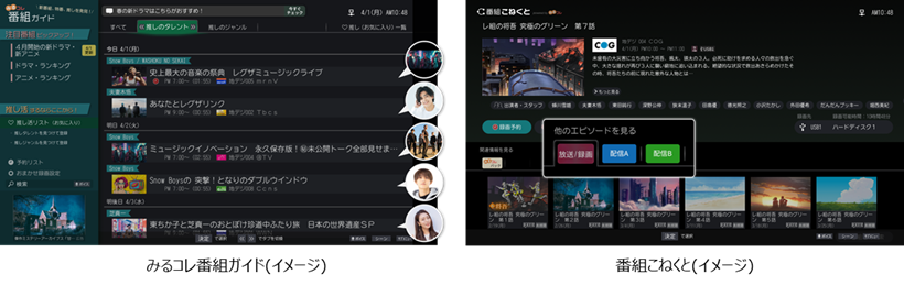 機能面では、テレビ番組/ネット動画の垣根を超えて視聴したい番組をシームレスに探すことができる「ざんまいスマートアクセス」に対応。さらに「みるコレ番組ガイド」が推し活などに役立つ機能として進化しています。気になるアイドルや俳優などを登録すると、そのタレントだけを集めた推しの出演番組スケジュールを表示。推し活を強力にサポートします。また、新機能の「番組こねくと」では、近年増えてきた見逃し配信の視聴をサポートします。気になるテレビ番組がどの動画配信サービスで配信されているのかを簡単にチェックすることができるため、見逃し配信先を見つける時などに便利ですね。