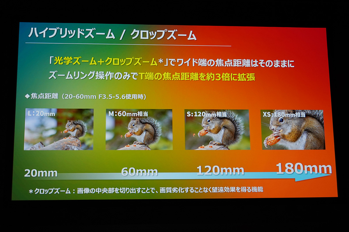 このほか、画像の中央部を切り出して望遠効果を得るクロップズーム機能と光学ズームを組み合わせることで、ズームリングの操作だけで焦点距離を最大約3倍まで拡張できます。