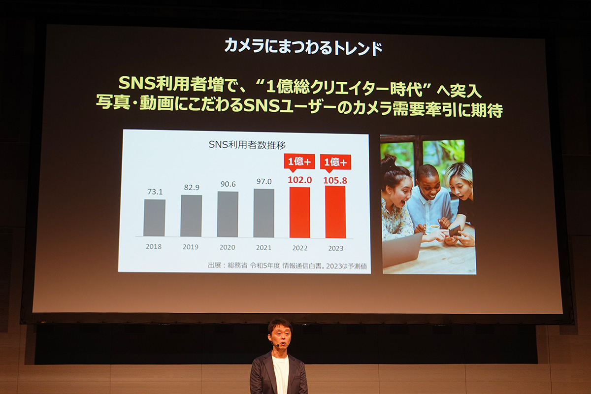 発表会の場で、パナソニック エンターテインメント&コミュニケーションの副社長執行役員 イメージングソリューション事業部長の津村敏行さんは、カメラ業界を取り巻くトレンドにおいて、SNSの利用者が大きく伸び続けていることを指摘しています。SNSだと撮影はスマホがメインではあるものの、カメラメーカーが積極的に製品を開発することで今後のカメラ市場をけん引していける、と考えているそうです。