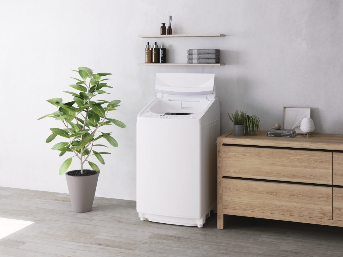 加えて、衣類と洗剤液を温めて洗う「温か抗菌ウルトラファインバブル洗浄W」や、洗濯槽の洗浄タイミングを知らせる「槽洗浄めやすサイン」も搭載。本体は、設置性を考慮したコンパクト設計を採用しています。