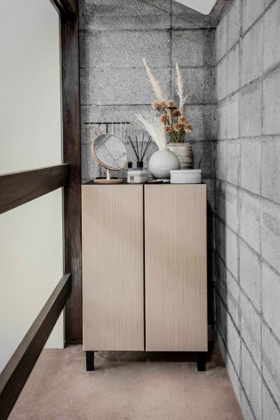 天板にアクセサリーやコスメ、鏡を置けば、「LOOC」が女性のための特等席になります。「LOOC」は縦長のデザインなので、垂直方向に伸びるものを置いてあげると、空間のバランスがよくなります。壁に大きな鏡を吊るすのもいいかもしれません。