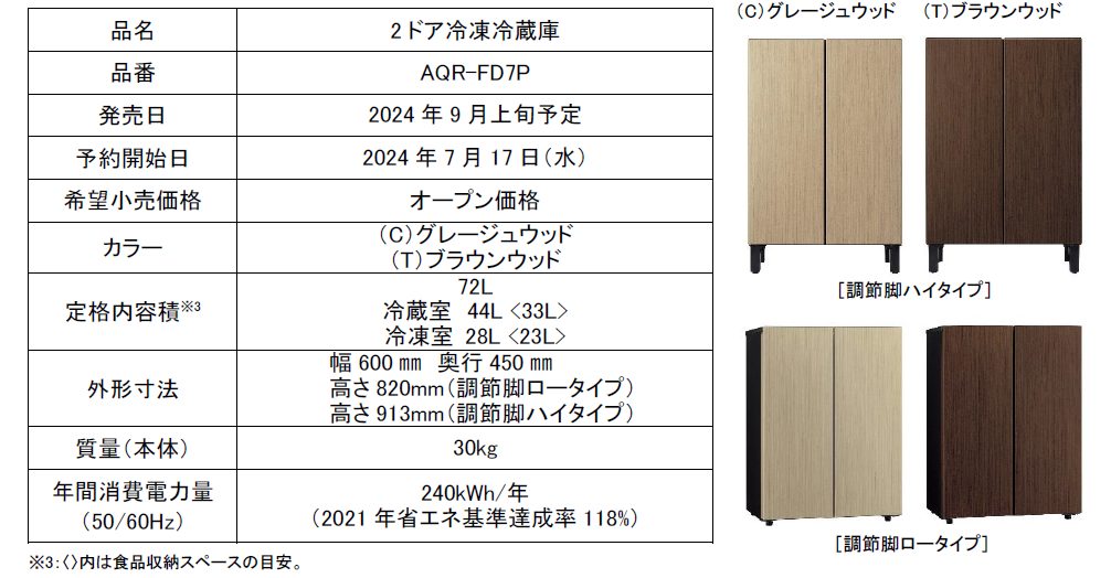 アクアは、家具調の脚が付いたキャビネットのようなデザインの2ドア冷凍冷蔵庫、家具冷蔵庫「LOOC(ルーク)」の予約を開始。2024年9月上旬から販売開始の予定です。