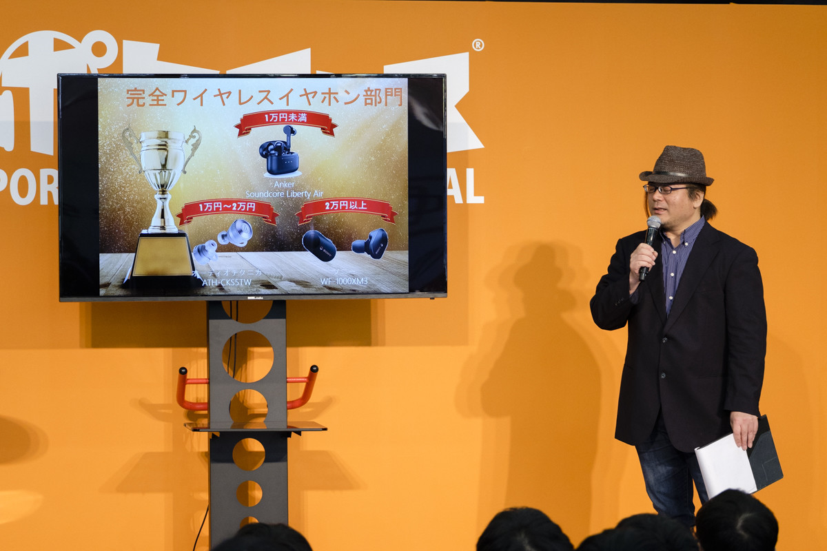 ワイヤードヘッドホン部門は価格帯で2部門に分かれています。ヒートアップする部門なので、もっと細かく分けるべきと野村さんの語りにも熱が入ります。「どちらのモデルも納得ですね。特に10万円以上のD8000 Proは、音にすばらしさに我慢できず私も購入しました。45万円もしたのですが……皆さんもぜひ購入して僕と仲間になりましょう!」と野村さん。ATH-WP900に関しては「8万円と高額モデルですが、こちらも買ってしまいそうです。かなりオススメのモデル。アラウンドイヤータイプなのでモバイルでの使用にも向いています」とのことでした。