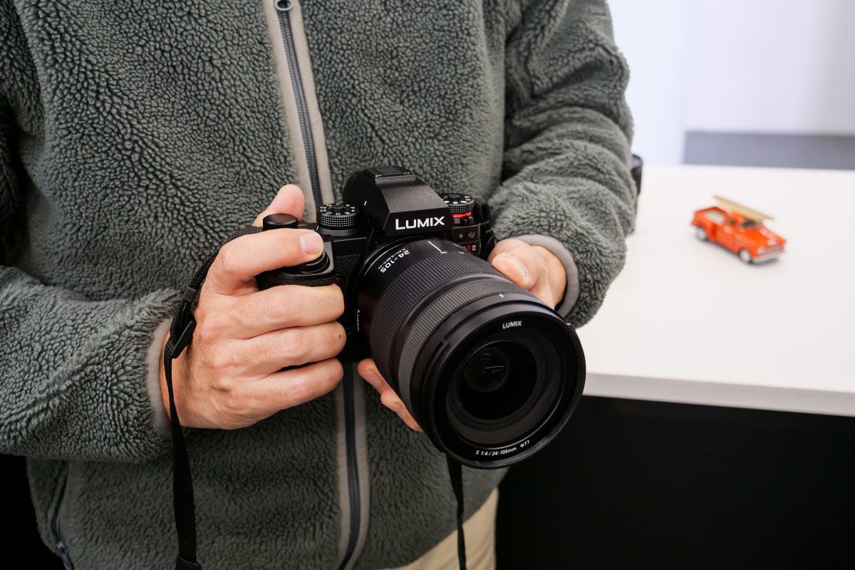 そして前モデルから大幅な小型軽量化が実現した。横幅で約14.6mm、縦が約7.7mm、奥行きが約4.9mmとかなり小さくなっている。質量も約221g軽くなり、機動力は確実にアップ。正面視はLUMIX S5IIにかなり近いと言えるだろう。