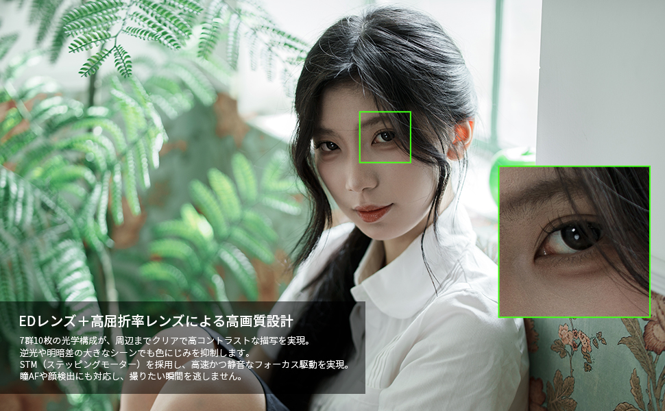 EDレンズ2枚と高屈折率レンズ2枚を含む7群10枚のレンズ構成により、開放値から画面中心部はもちろん、周辺部まで高いシャープネスとコントラストを維持。逆光や明暗差の大きなシーンでも、色にじみやフレアを抑制します。最短撮影距離は0.8mで、被写体に迫った撮影も楽しめます。