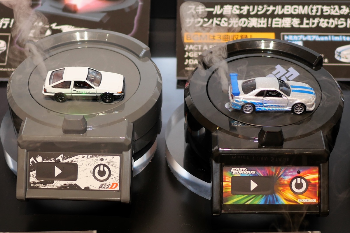 ↑「トミカプレミアムunlimited DRIFT TURN TABLE」。基本はターンテーブル。しかしてその実態は、ミニカーがドリフトしながらタイヤの摩擦煙(実際は水蒸気)とBGM、そして7色LEDで走りを演出するニクいやつ! 頭文字D仕様、ワイルド・スピード仕様の2種展開。各税込6600円。