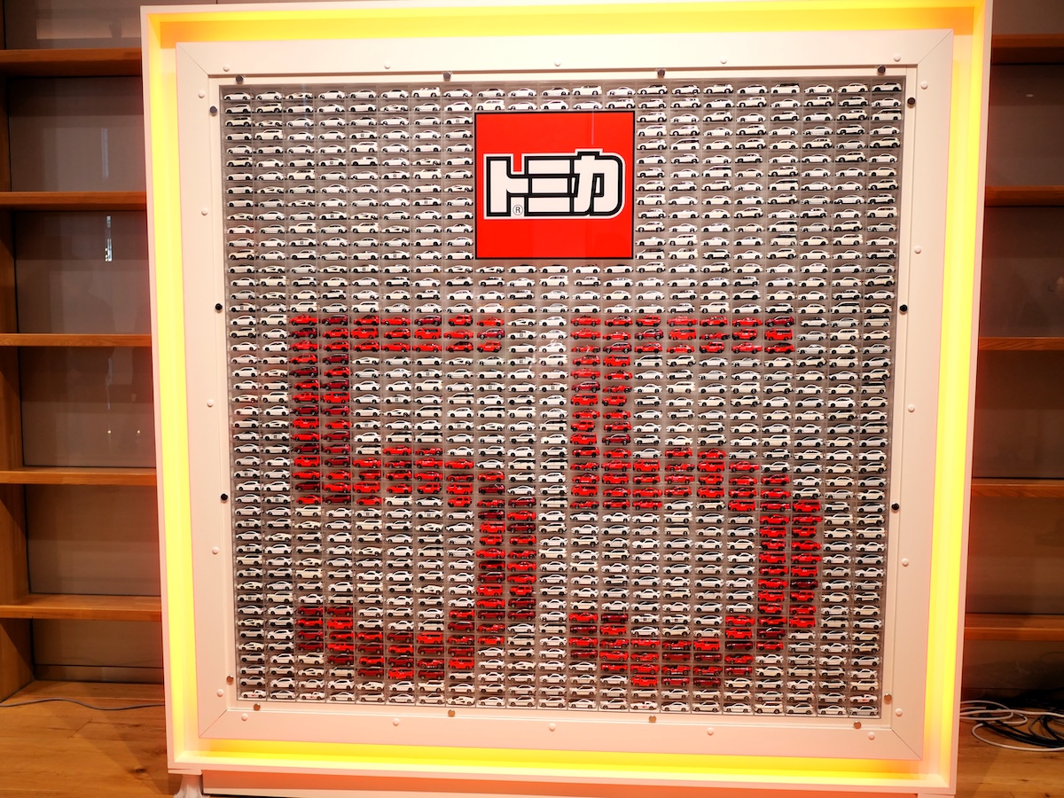 ↑発表会場を飾った55周年特製ディスプレイ。白と赤のトミカ953台を使用している。なお中央上の「トミカ」ロゴ部分はちょうど55台分のスペース。これまた55周年にかけたこだわりなのか、もしかして⁉