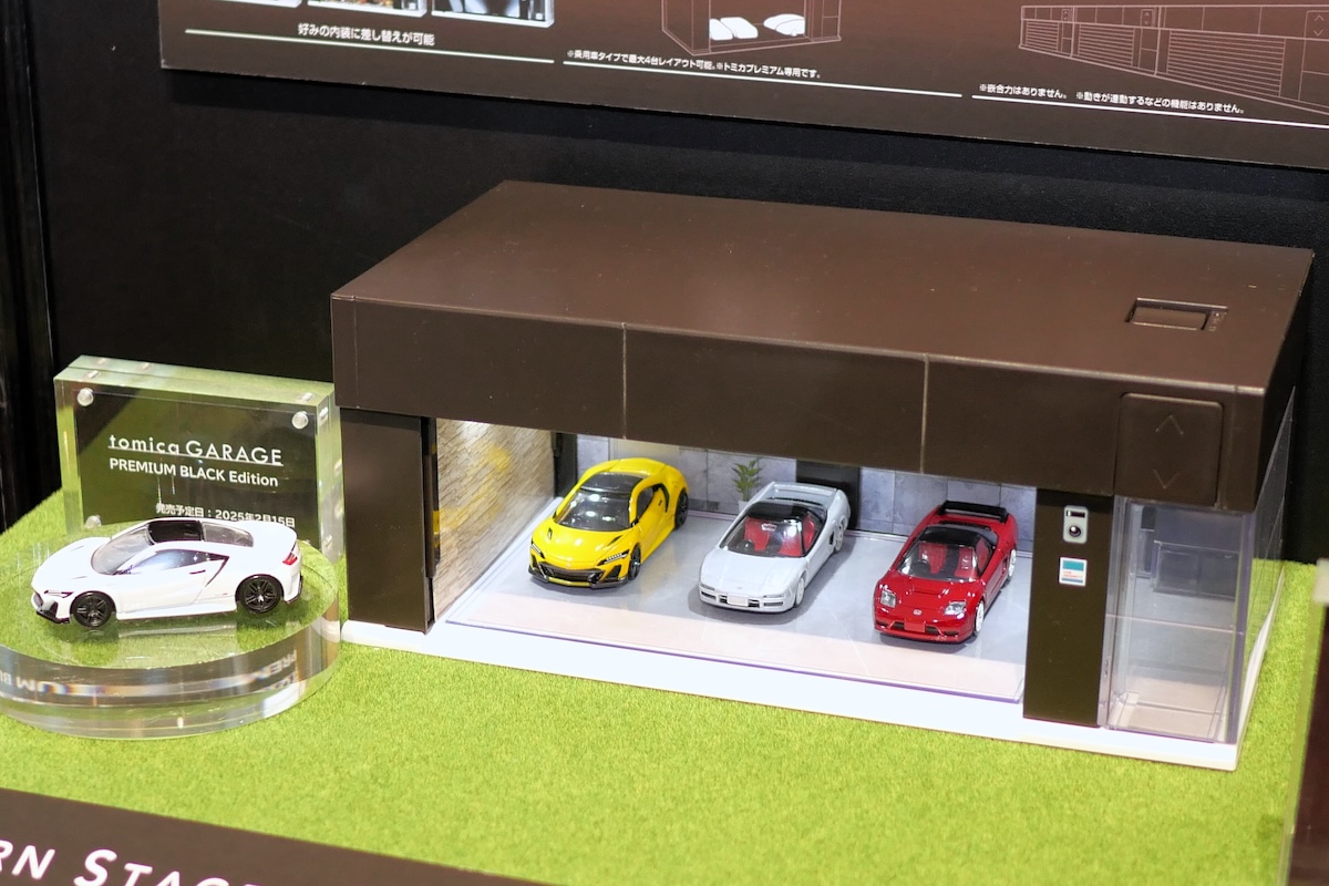 ↑「tomica GARAGE」はコレクションをニンマリ飾ることができるガレージで、照明のオンオフ、シャッターの電動開閉が可能とこだわり満タン! 写真の特色NSX(1台)が付属する。また付属のシートによって、ガレージ内壁面と床面のデザイン変更も可能なのも涙ちょちょぎれ! 税込6600円。ランボバージョンもあり。