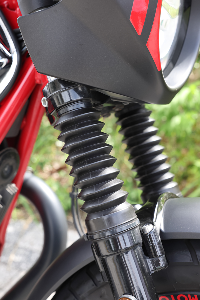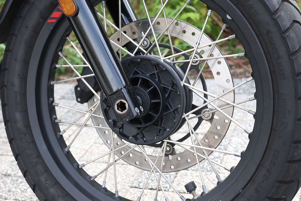 平嶋 純正オプションパーツのエンジンガードとエキパイのガードをつけました。あとは、フォークブーツですね。フォークブーツは、カタログの写真を見て最初からついているものだと思っていたら、カタログに載っていた写真は本国仕様で、日本仕様はついてないということでした。だから納車後にフォークブーツを買って、自分で取りつけました。エンジンガードやフォークブーツは、見た目というより保護のためですね。