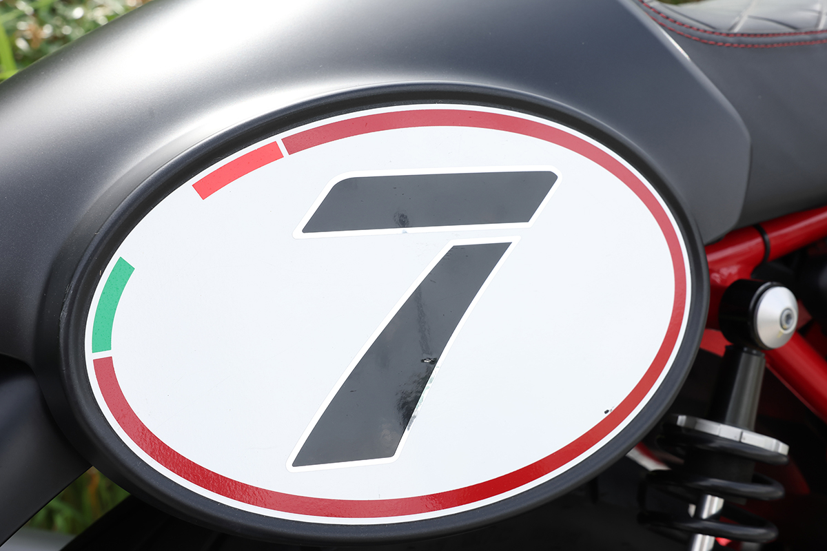 平嶋 クロームメッキのガソリンタンクです。パッと目を惹くのがいいなぁと思います。あとは、シングルシートカウルにゼッケンプレートが付いていて、そこに「7」って数字がついてるんですけど、それが「なっちゃんの7なの?」ってよく聞かれます。おそらく「V7Ⅲ」の「7」だと思うんですけど、自分の名前みたいで気に入っています(笑)。
