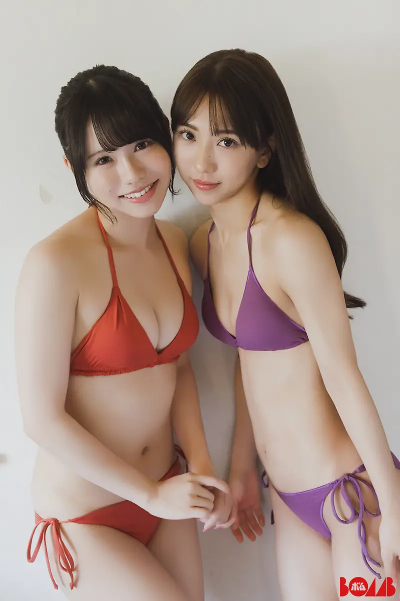 同じくSKE48から、35枚目シングル『Karma』で初選抜メンバーとなった相川暖花と西井美桜のペア水着グラビア。期もチームも違い初ペアとなる2人だが、ホースで水をかけ合うなど楽しそうに夏のグラビアを満喫している。