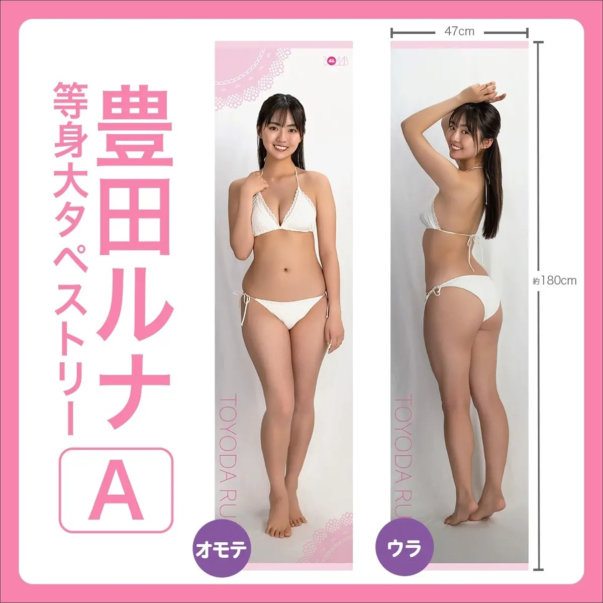 「等身大タペストリー」は、両面に豊田の水着姿がデザインされており、正面からも後ろ姿からも両方の絵柄が楽しめる。PET紙(ペットボトルと同じプラスチック製、汚損に強く、耐水性にも優れた素材)を使用しているので、色あせにも強く、水濡れOK素材なので、お風呂に飾ることも可能。タペストリーのデザインは水着の衣装違いで3種類が用意されており、直筆サイン入り商品も販売される。