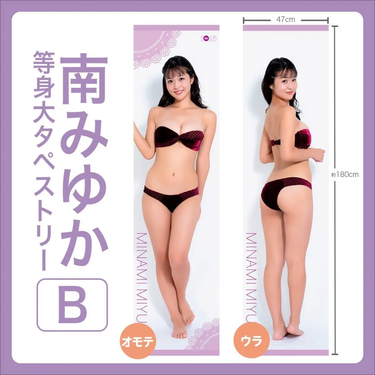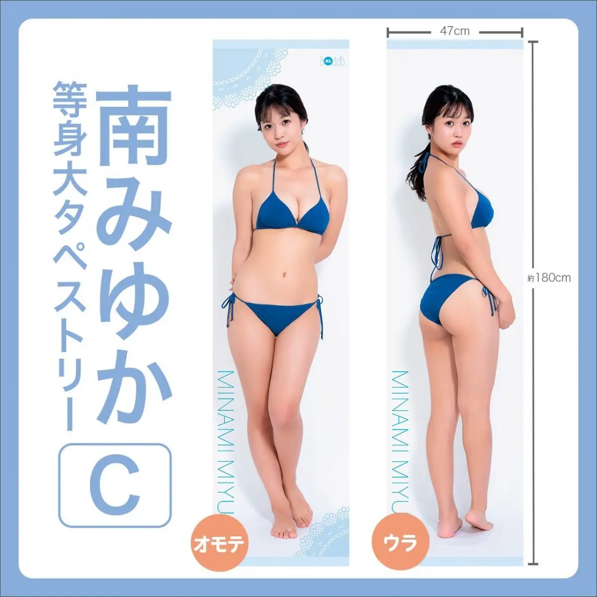 「等身大抱き枕カバー」は、南みゆかの水着グラビア写真が両面にデザインされており、正面と後ろ姿の両方の絵柄が楽しめる。やわらかく、もっちりとした最高級の生地を使用しており、ギュッと抱きしめれば、そのやわらかい肌触りに癒やされること間違いなし。ベッドで一緒に添い寝できるのはもちろん、ひざ枕的な使い方もできる。商品は水着の衣装違いで3種類が用意されている。