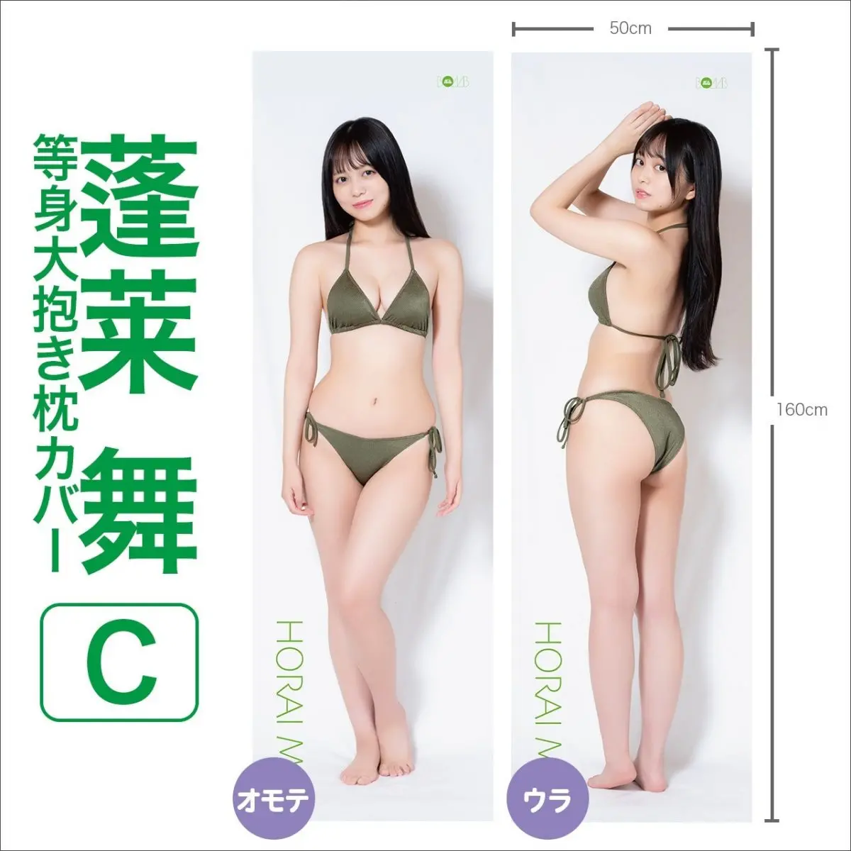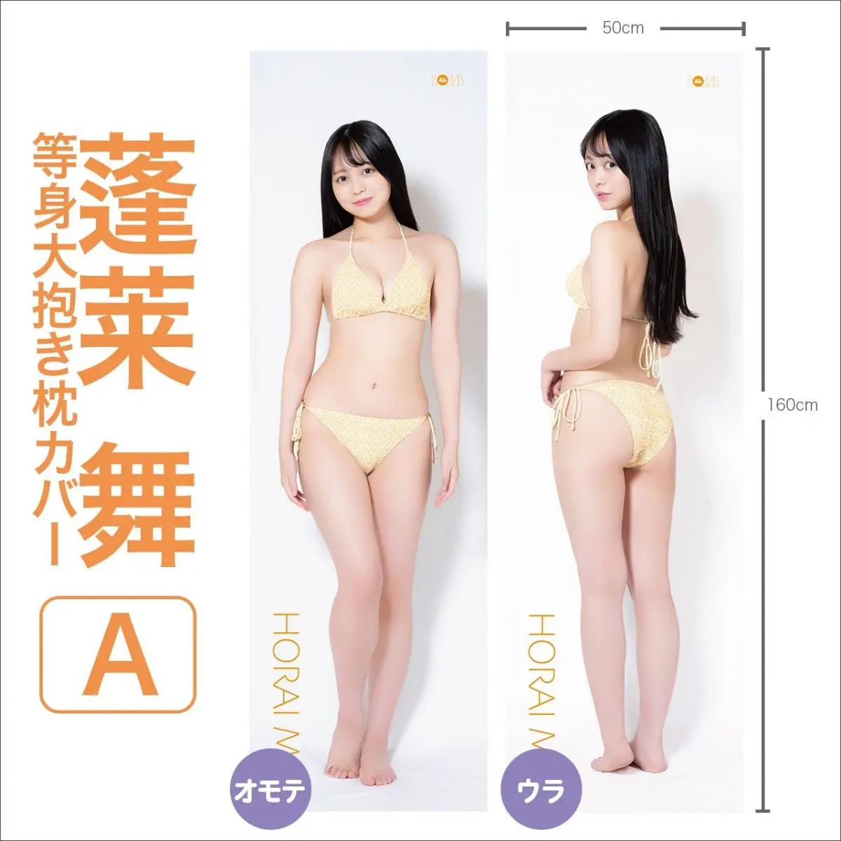 「等身大抱き枕カバー」は、蓬莱舞の水着グラビア写真が両面にデザインされており、正面と後ろ姿の両方の絵柄が楽しめる。やわらかく、もっちりとした最高級の生地を使用しており、ギュッと抱きしめれば、そのやわらかい肌触りに癒やされること間違いなし。ベッドで一緒に添い寝できるのはもちろん、ひざ枕的な使い方もできる。商品は水着の衣装違いで3種類が用意されており、直筆サイン入り商品も販売される。