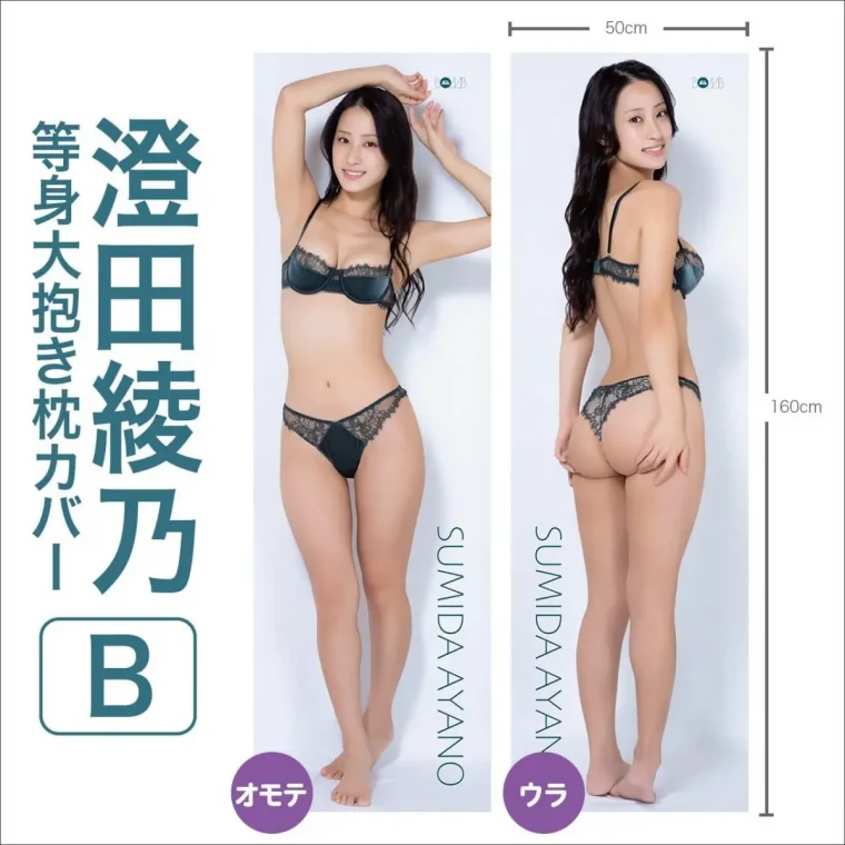 両面仕様で、ドキッとする素肌感あふれるピンクの三角水着のタイプA、シックで大人っぽい澄田が堪能できる深緑色のチューブ水着のタイプB、セクシーさ限界突破の黒水着のタイプCの3タイプが用意されている。ベッドで一緒に添い寝できるのはもちろん、ひざ枕的な使い方も。写真プリントもリアルで、まさに隣に澄田がいる感覚が楽しめる。