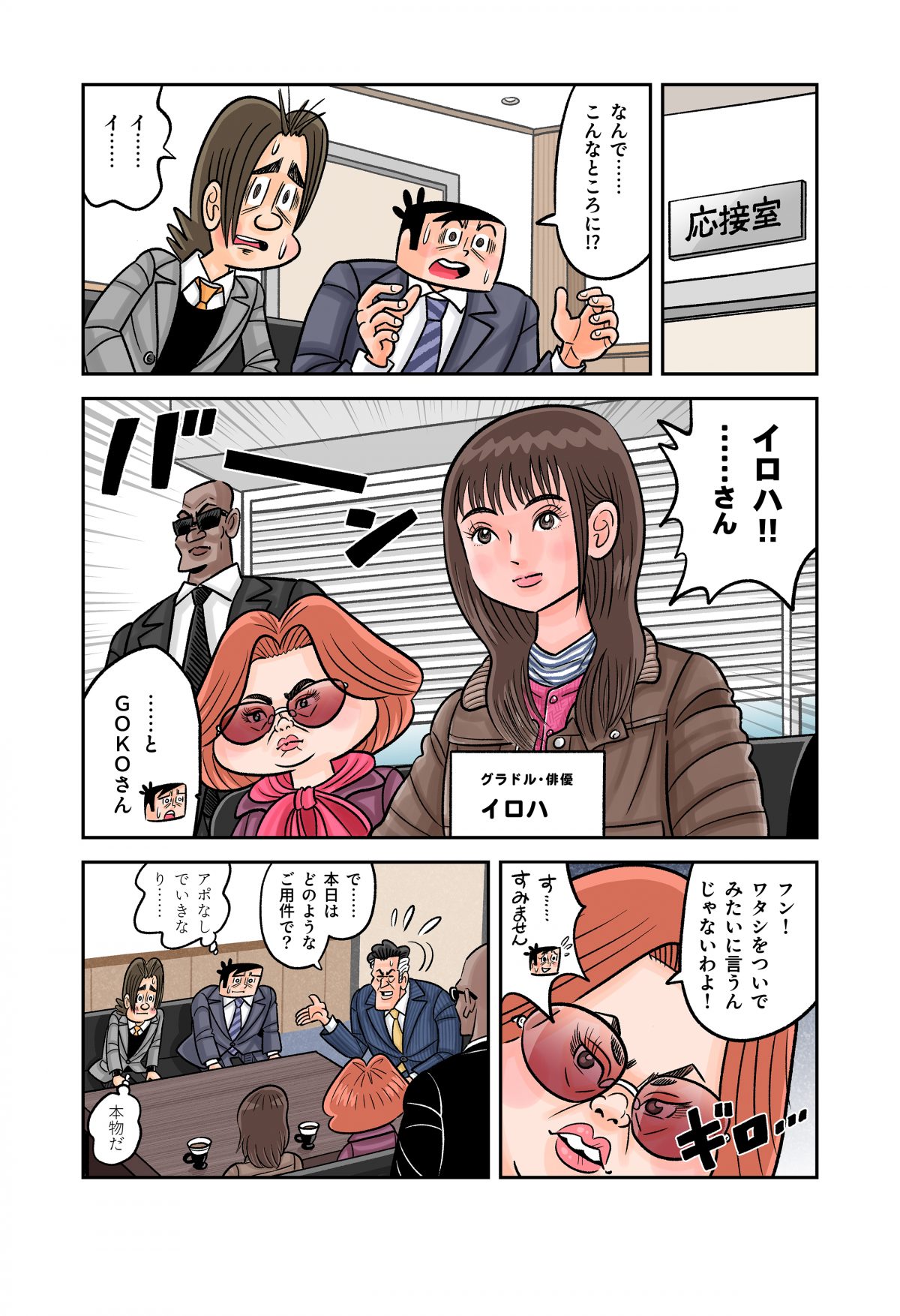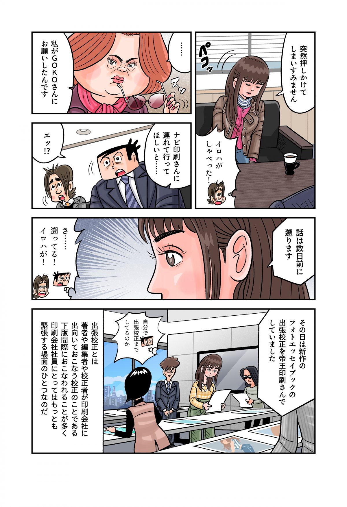 刷り直しで凹む刷元さんらナビ印刷のもとに、沖田くんが応援するグラドルのイロハさんがGOKOさんと一緒に訪れてきた……。