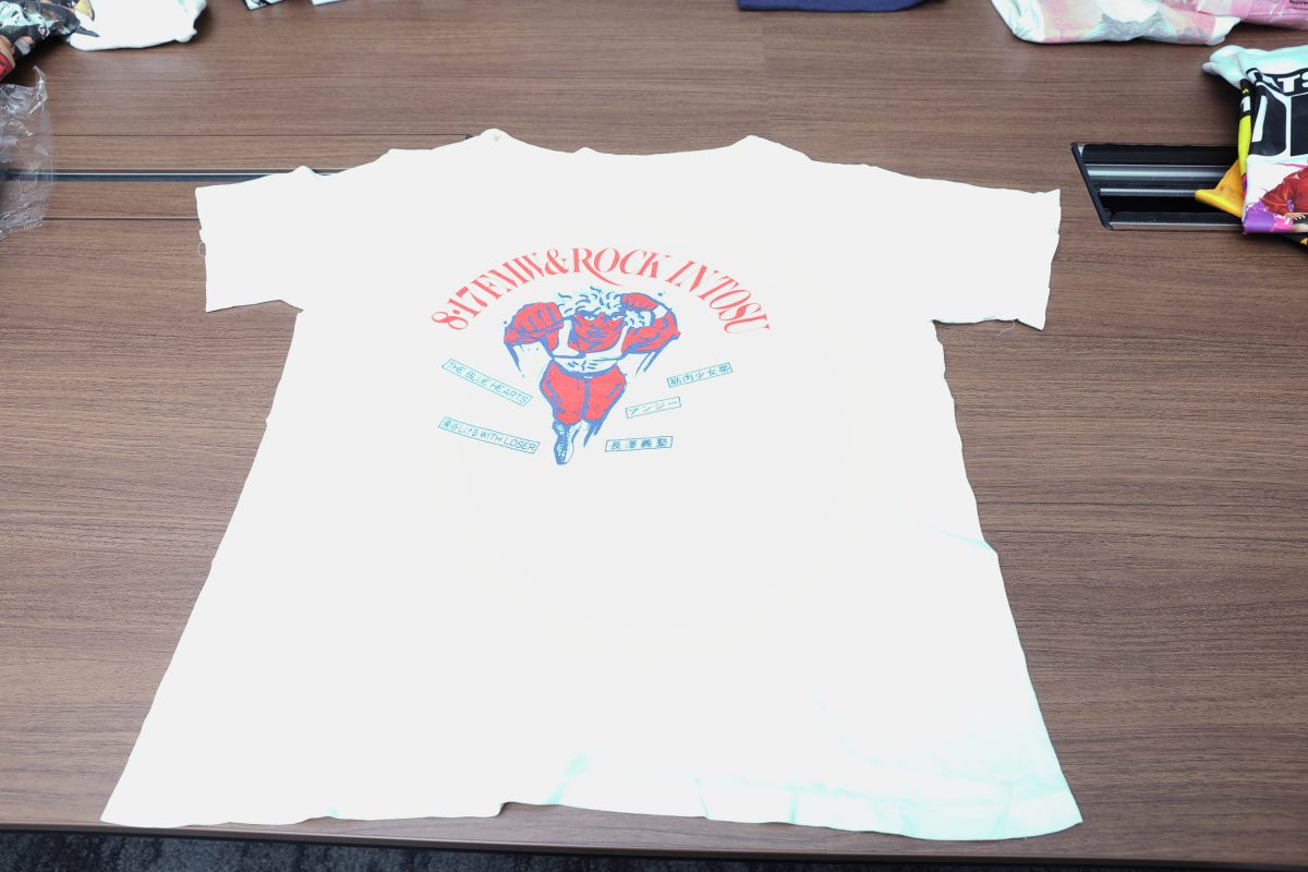 本間 そうです、そうです(笑)。大仁田さんのイラストの周りに出演バンドの名前が入っていて、けっこうレアだと思いますね。Tシャツのかたちがパンクな感じだったんで、監督に「自分で切ったんですか?」って聞いたら、「いや、これで売ってた」とおっしゃってたんですけど、エリの部分に手作り感があるのでさすがにリメイクしたものだと思います。