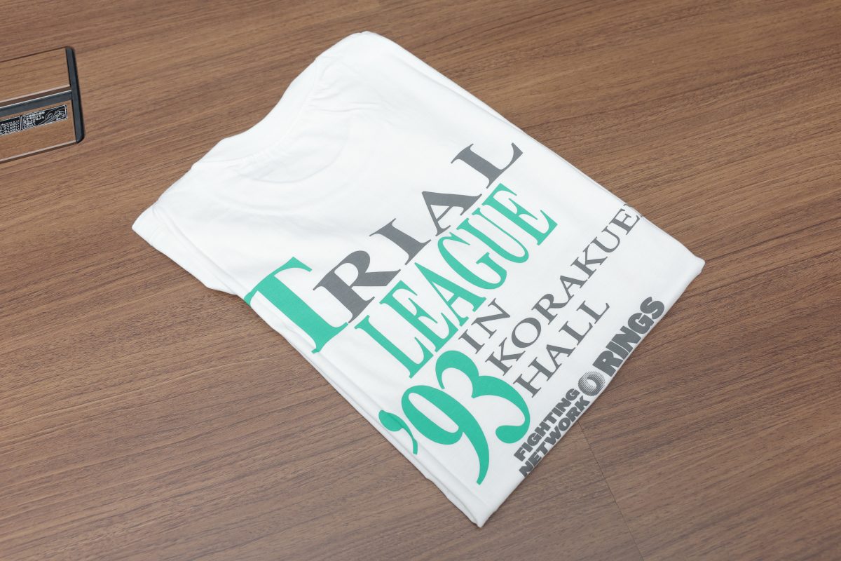本間 そうなると、リングスが1993年2月28日に後楽園ホールで開催した『後楽園実験リーグ』のTシャツですね。これは僕が10歳のときに高校生の兄貴に、人生で初めて会場に連れてってもらった大会のTシャツで、たまたまヤフオクに新品が2,000円くらいで出品されていたので即購入しました。見つけたときはメッチャうれしかったですね!