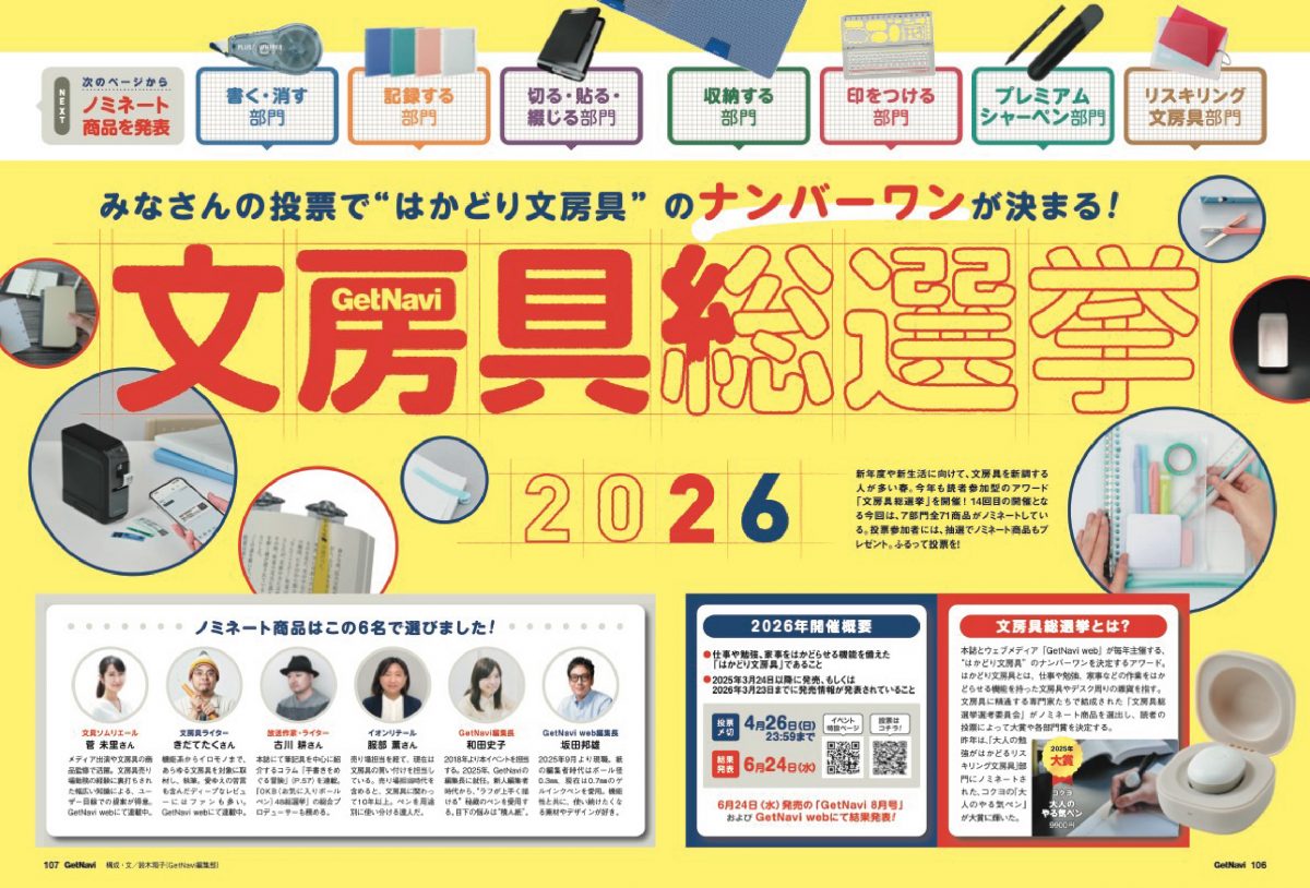 雑誌『GetNavi(ゲットナビ)』の5月号が発売。常識をアップデートする新生活アイテムとその活用術を特集するほか、「家電大賞2025-2026」の結果発表、文房具総選挙2026のノミネート商品発表など、注目特集が揃い踏み!