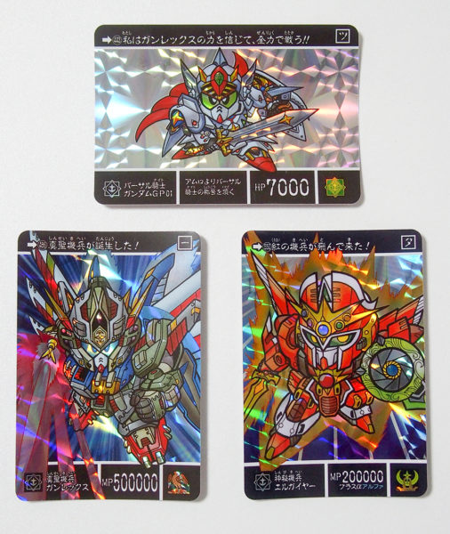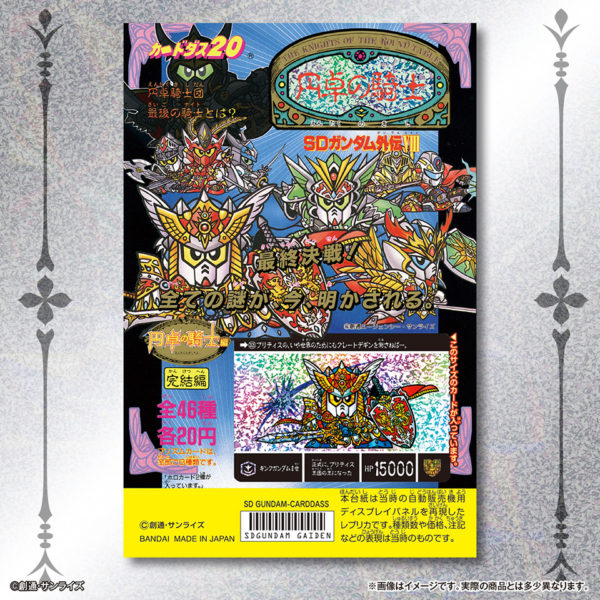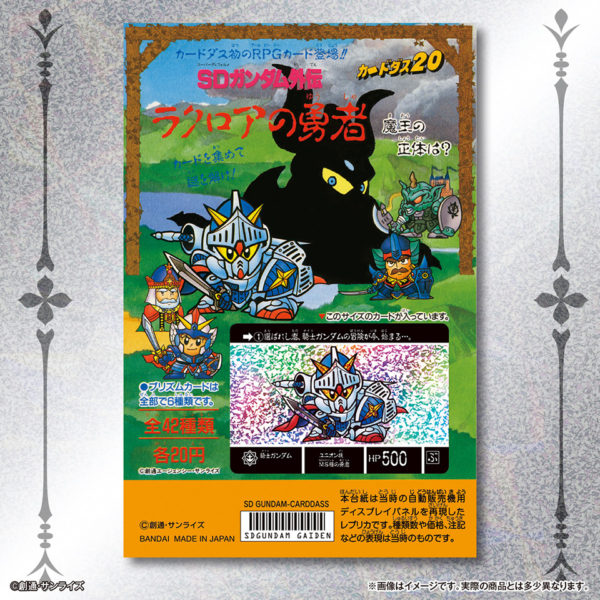 そしてラストはSDガンダムですが、こちらはなんとカードダスそのものではなく、ミニ自販機用のディスプレイシートだけをガッツリ集めたマニア向けのコレクションです。「ラクロアの勇者」から始まる「SDガンダム外伝」シリーズを32枚のミニディスプレイシート化したうえ、以前の復刻カードセットでは実現されなかったプリズム加工も施されるとのこと。これは「カードダスは当時品をすでにコンプしてて……」というような強者も必見のレアアイテムになりそう。