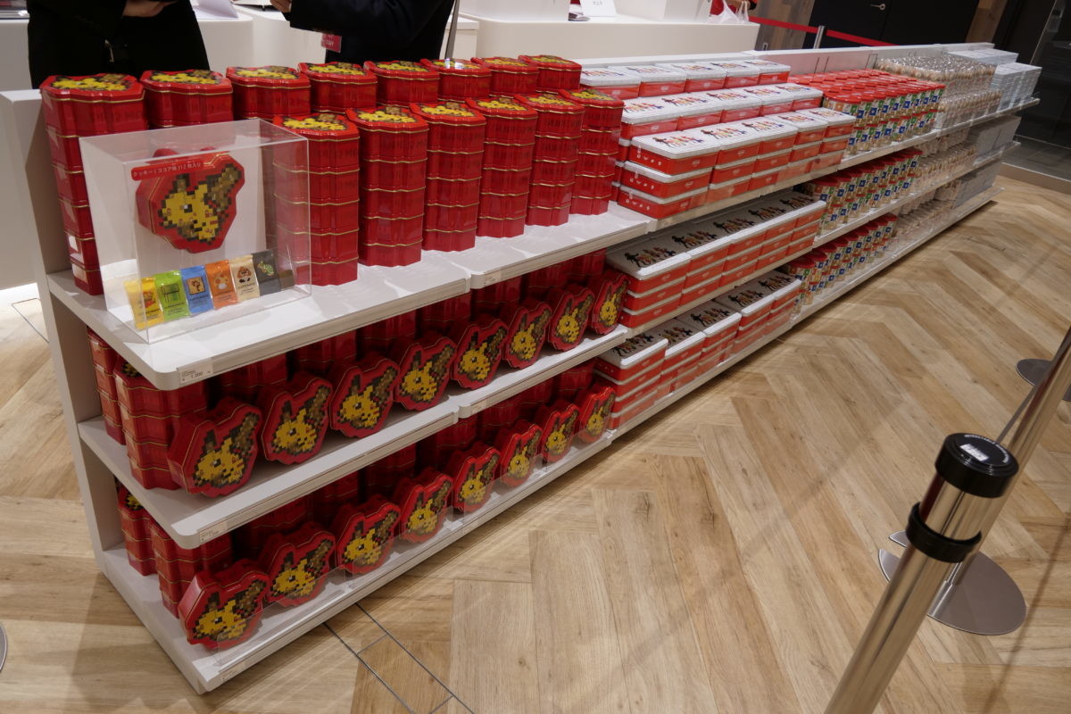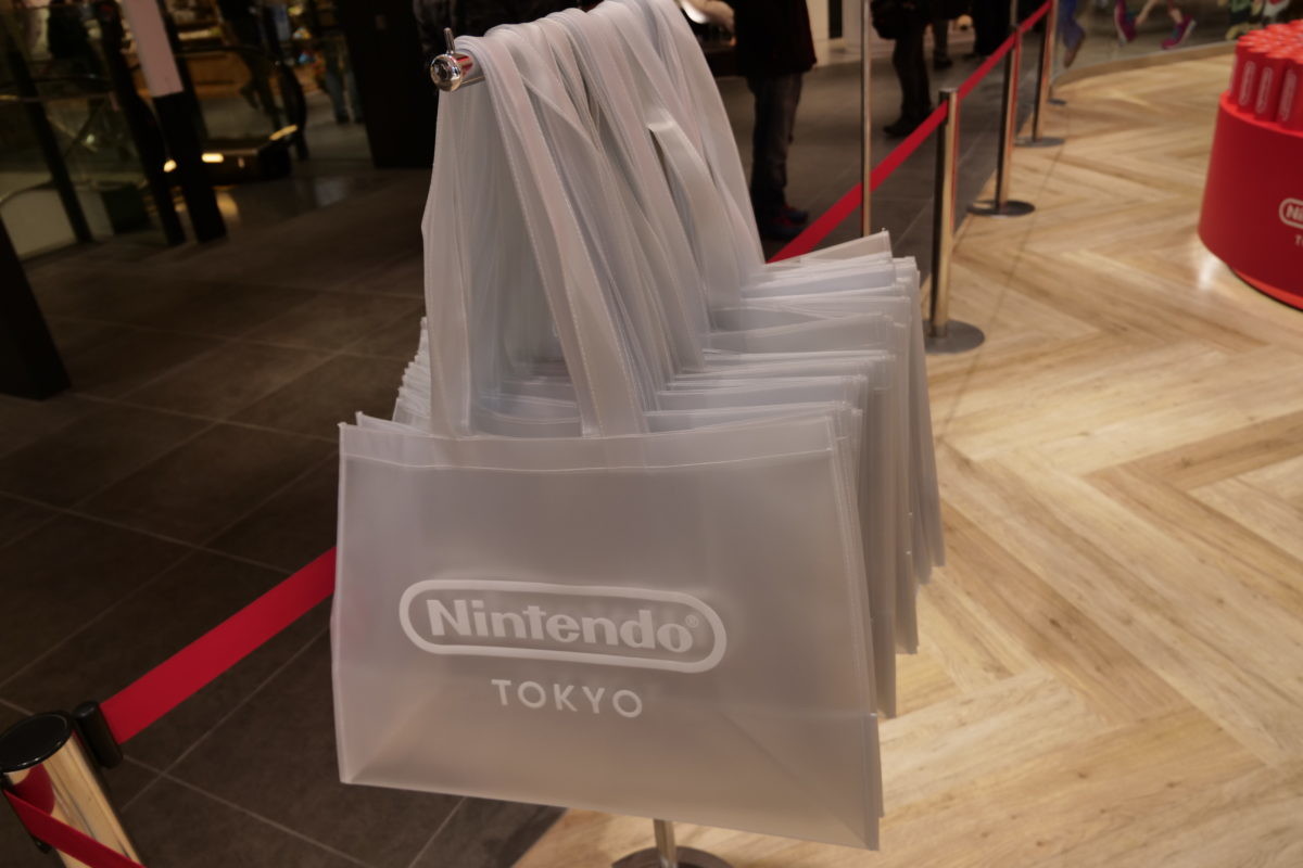 レッドとグレーの2色カラーリングで、Nintendo TOKYOのロゴがシンプルに配置されています。そのシンプルさが逆に目を引くデザインです。パッケージもオシャレな紙の筒です。ショップの店員さんも、似たようなデザインの制服(赤いポロシャツ)を着ています。