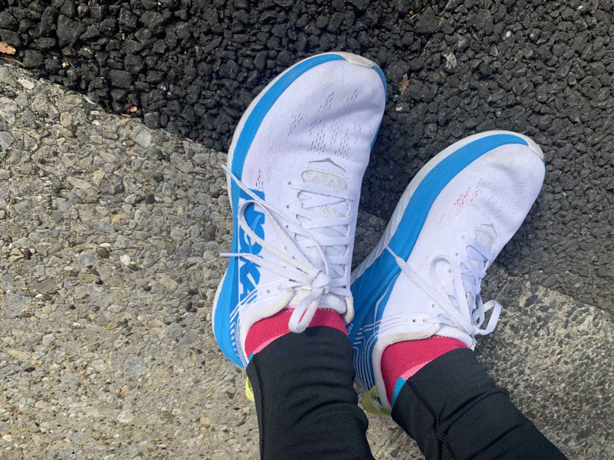 厚底ランニングシューズの先駆け、HOKA ONE ONEが2019年夏に発売したカーボンプレート入りのランニングシューズ。「CARBON X」を履いて立ち上がった瞬間の、足が自然と前に出てしまう感じ。初めて履いたときは感動しました。厚底となると必然的に重さが出てしまいそうですが、ソールのボリュームからは想像もつかないくらいの軽さです。