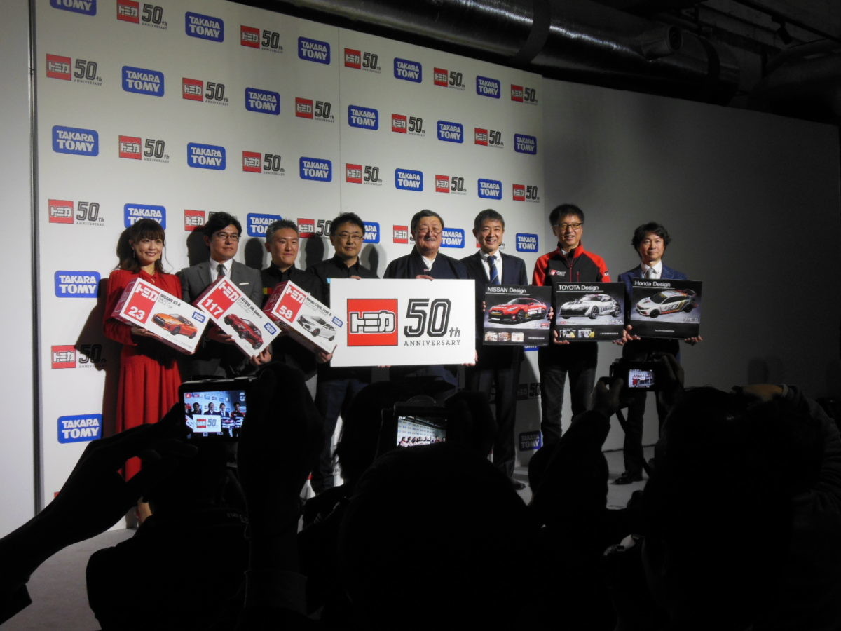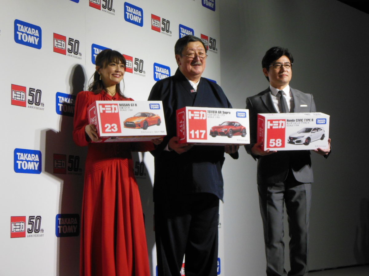 今回のイベントは「トミカ50周年記者発表会」として、東京のウォーターフロントである天王洲で行われました。司会進行役はカーオブザイヤーの選考委員でもある元TBSアナウンサーの安東弘樹さんと、トミカファンとしても知られる小林麻耶さん。壇上にではタカラトミーの富山幹太郎会長が登壇し、ブランドを支えてくれた多くのファンと関係者に向け、50周年を迎えられた感謝の気持ちと共にトミカの50年後、100年後に対する熱い思いが語られました。
