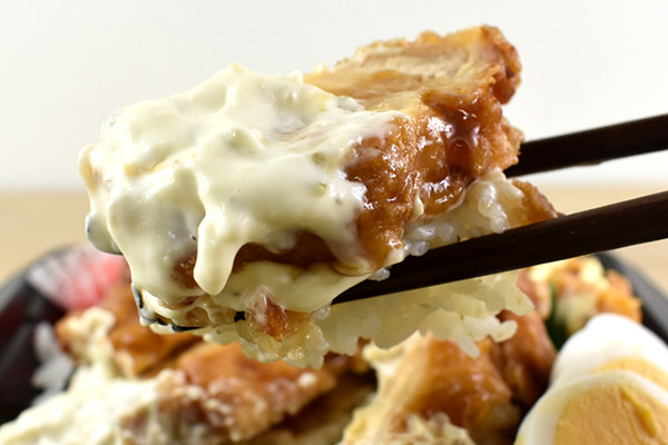 まずはチキン南蛮を一切れ食べたところ、甘酢たれの甘さがかなり際立っていました。噛むたびに肉汁がジュワッと溢れだし、ご飯がどんどん進みます。さらにタルタルソースをかけるとやみつき感がアップ! 濃厚かつ爽やかな口当たりがプラスされ、チキンの旨味と相性バツグンですね。