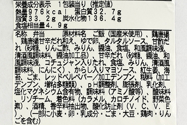 フタに丸い「満腹シール」が貼られた同商品。眺めているだけでお腹が膨れそうなほど、たっぷりと唐揚が入っています。唐揚の他にも、ご飯と輪切りのゆで卵などを味わえる模様。チキン南蛮の一切れがとても大きく、見た目のインパクトが半端ではありません。