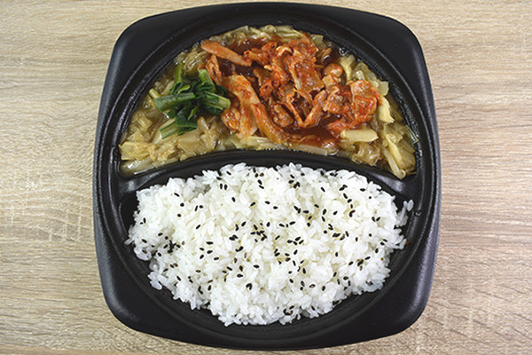 プレートタイプの容器に入った同商品。真っ赤に染まった豚キムチは、“あんかけ”のようなとろみのあるタレで味つけされています。玉ねぎやキャベツ、にら、もやしなどの食材が入っており、かなりボリューミーな印象でした。フタを開けると、キムチとにらのこうばしい香りを楽しめますよ。