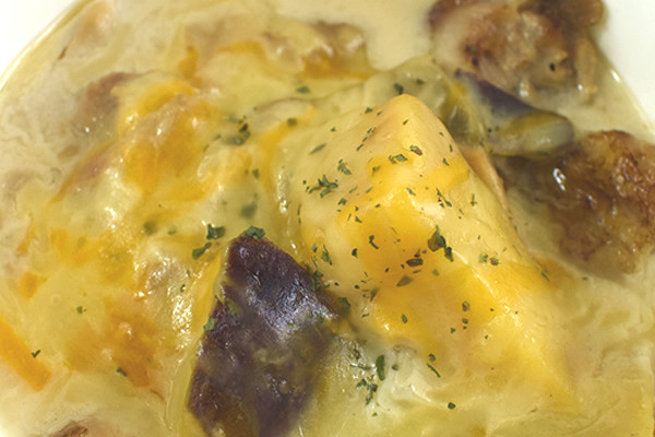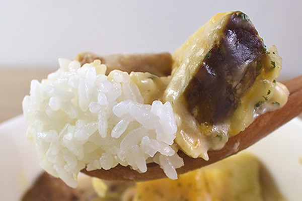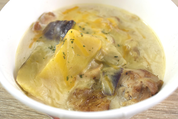 ホワイトソースの中には、ひと口大の鶏もも肉とさつまいもがたっぷり入っていました。どちらも食べ応えがありそうですが、やはりホワイトソースとのハーモニーが気になるところ。果たしてお味の方は…?
