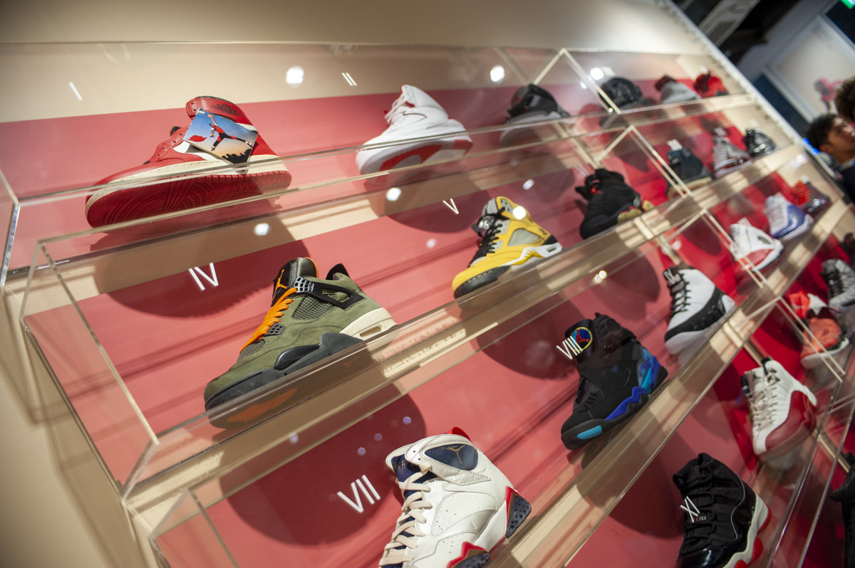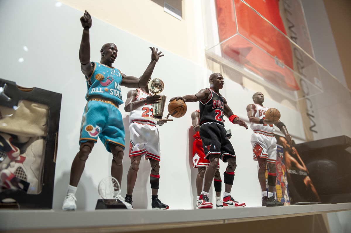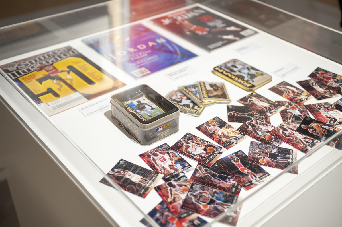 店内には、NBAの歴史の立役者の一人、マイケル・ジョーダンのコレクションが展示されるミュージアムのような空間も用意。アメリカでは熱狂的なコレクターも多いトレーディングカードや雑誌、スニーカー。それら以外にもフレグランスやフィギュアなど多くのアイテムが並び、ジョーダンの歴史を感じます。またマイケル・ジョーダンの背番号23がナンバリングされたブルーとレッドのユニフォームなど、マニア垂涎のアイテムもあり、ファンの目を楽しませていました。