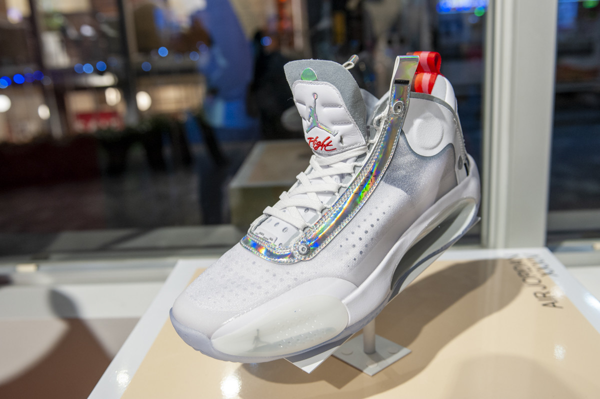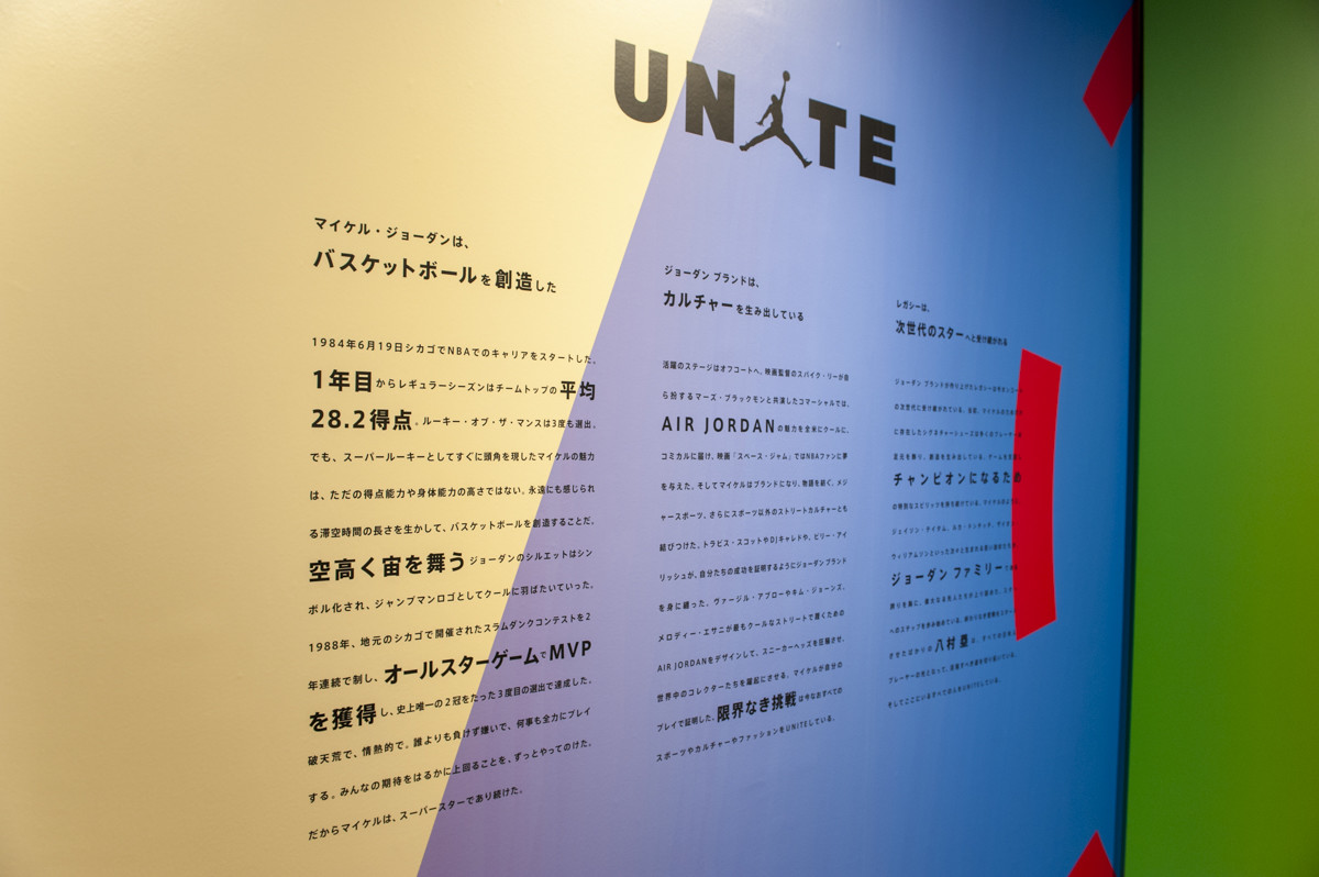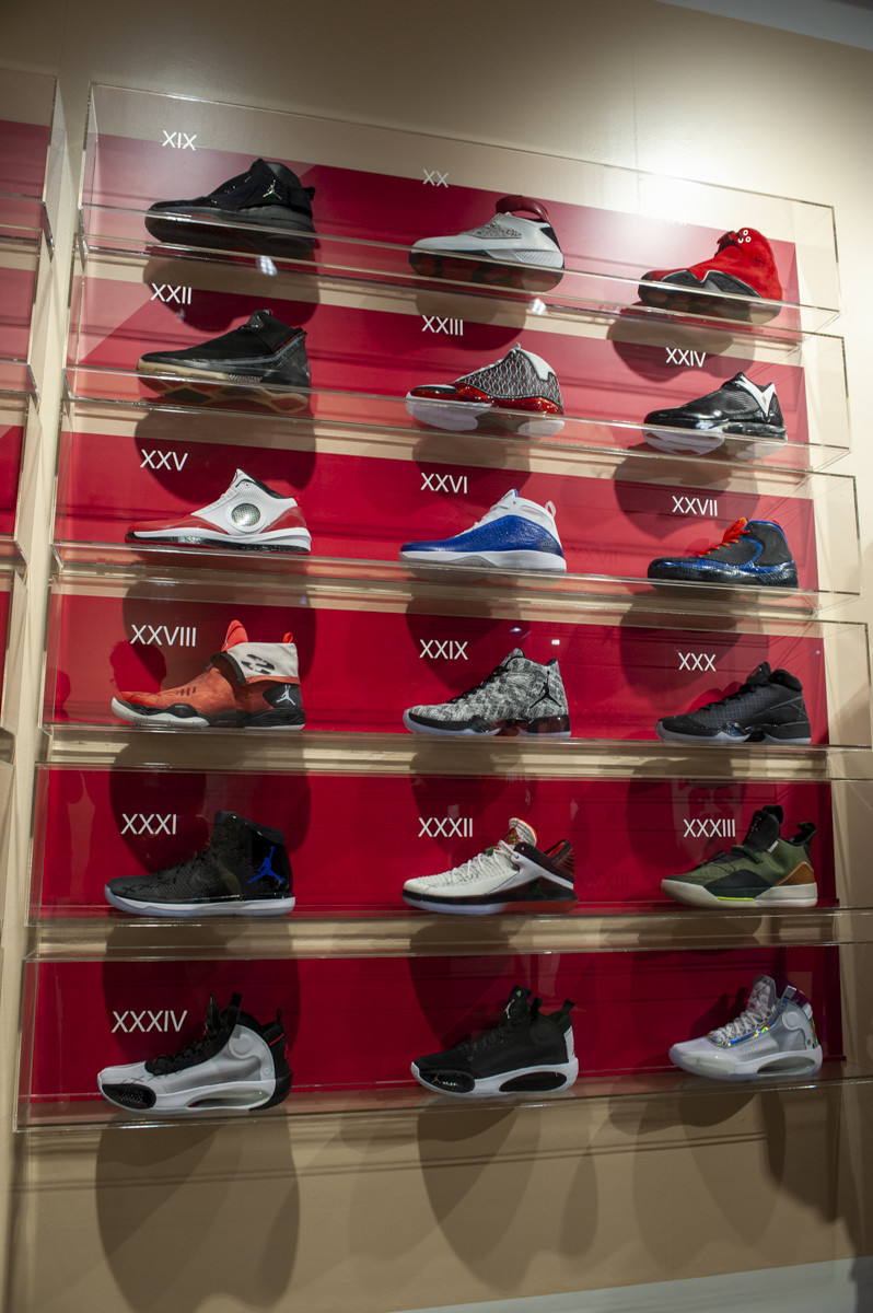 こちらは、これまでのエア ジョーダンの歴代モデルが並ぶスニーカーウォール「HISTORY OF AIR JORDAN」。シカゴカラーの「ジョーダン 1」に始まり、各モデルを代表するカラーのシューズが展示され、最新作の「XXXIV(34)」まで圧巻の内容。今でも頻繁にリリースされる人気モデルやマニアが好むモデルなど、エア ジョーダンの進化と変遷を感じられました。