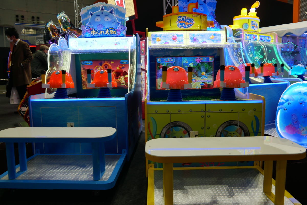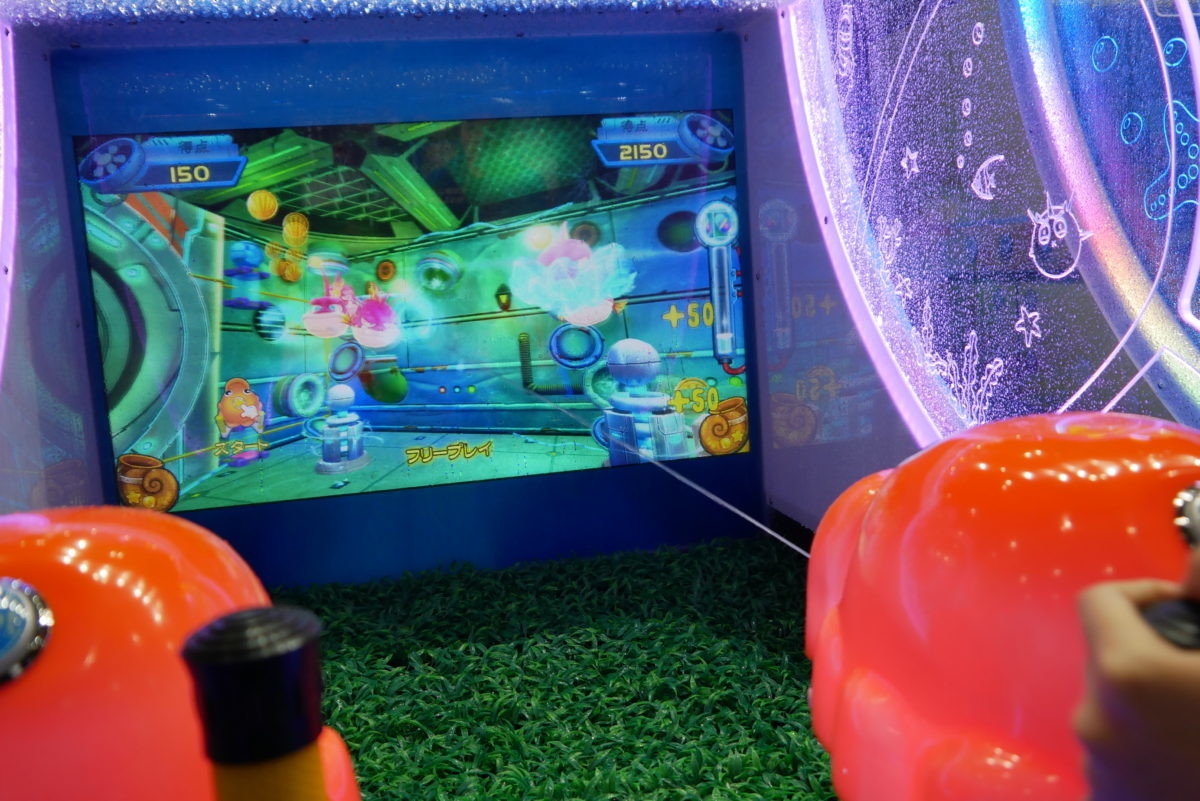 また、バンダイナムコテクニカブースでは、「水でっぽう大冒険」「サブマリンレスキュー」も展示されていました。両作とも実際に水を噴射して敵を倒すゲームです。
