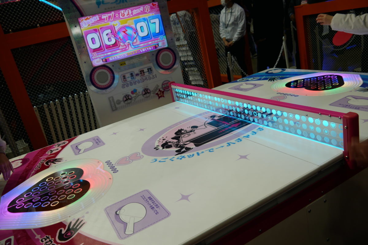 一見普通に卓球を楽しむゲームに見えますが、台の中央に手を置いて「ラブパワー」の測定をしたり、点を取ると中央のネットが動いたり、終盤にはネットが動き続けたり、ラブパワーを特定しながら卓球をしたり、突如特典が倍になる展開に突入したり…と、卓球の概念を破壊するような「愛情診断バラエティ卓球」ゲームです。本作を担当したバンダイナムコテクニカの笹島氏曰く「こういう対戦ゲームは負けている方はつまらない。なので負けている方がどれだけ楽しめるかということを考えました」とのことでした。