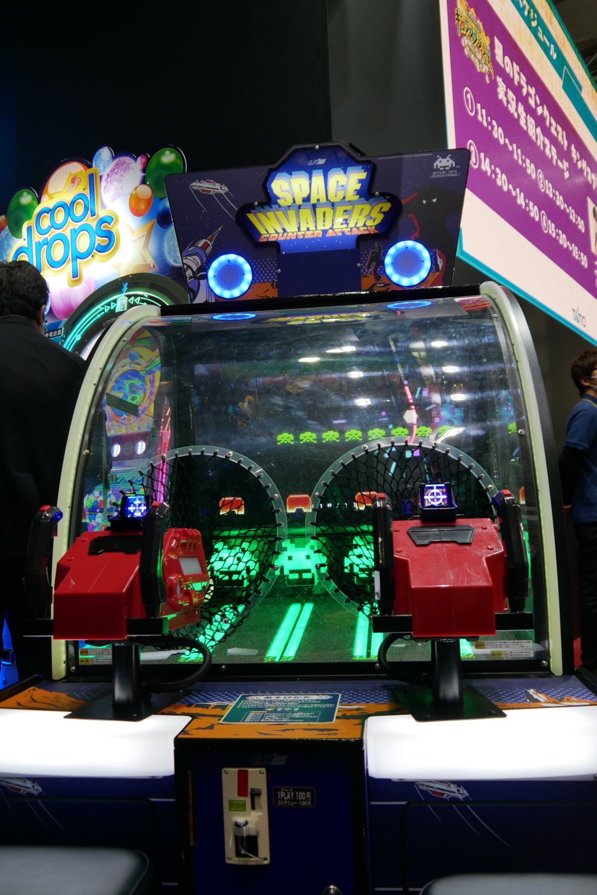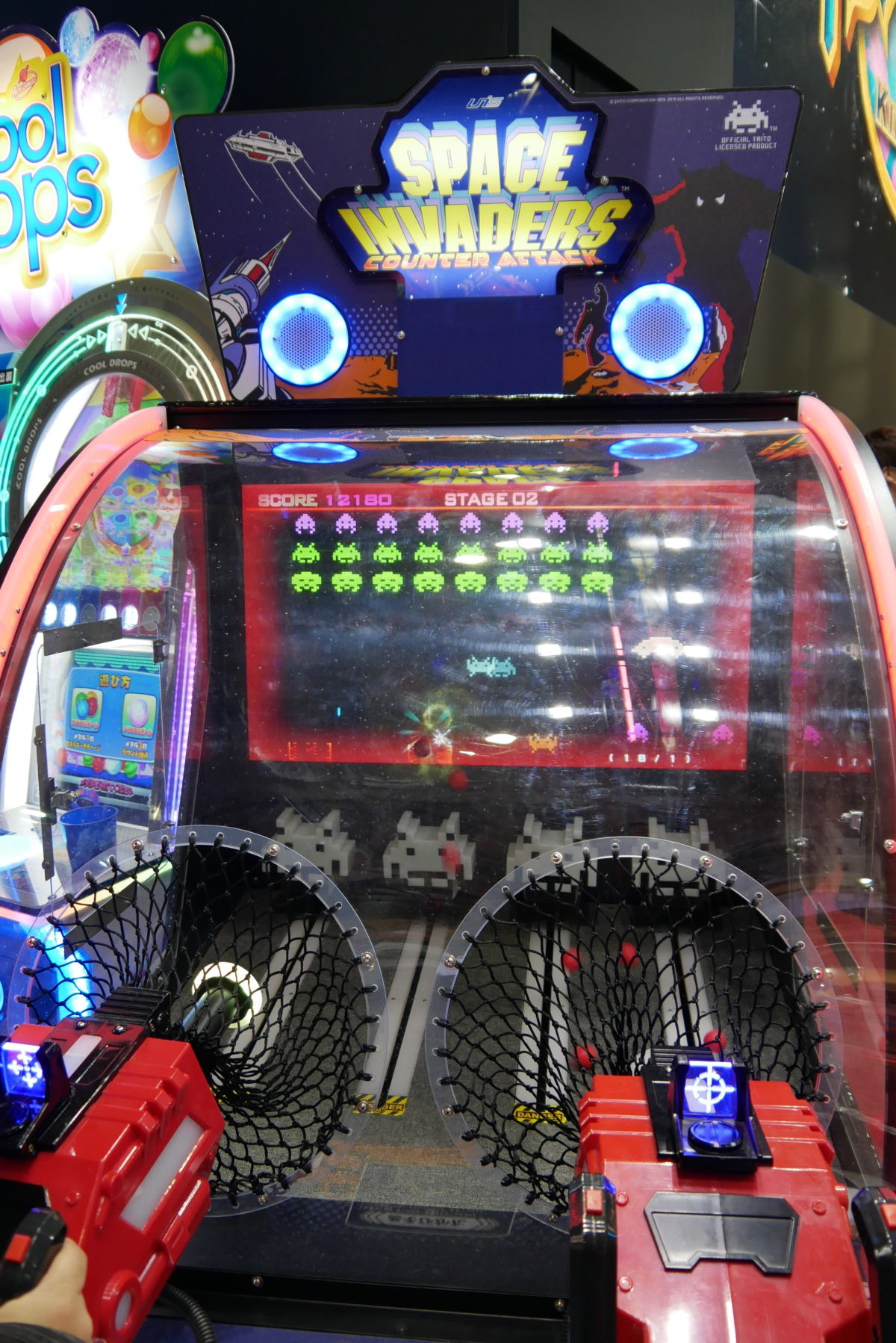 約40年前に一大ブームを巻き起こした、アーケードゲームの金字塔「スペースインベーダー」が、平面から立体に飛び出しました。ピンポン玉を発射して、画面の中や、画面の下から前に迫ってくるインベーダーをやっつける、リアル(?)なシューティングゲームで、画面の中と外を交互に攻略していきます。本作は、アメリカの会社がタイトーから許諾を得て開発した“海外産ゲーム”ですが、海外で本作が好評だったので、今回タイトーが輸入したという経緯があります。稼働は3月末~4月ごろで、現在ローカライズ中とのことです。筆者としては、90年代前半にヒットしたエレメカ「コズモギャングズ」を思い出しました(笑)。あれは“実弾”が飛ばない光線銃でしたが。しかしながら、“立体”になっても、カニさんはあの造形なのね…(笑)