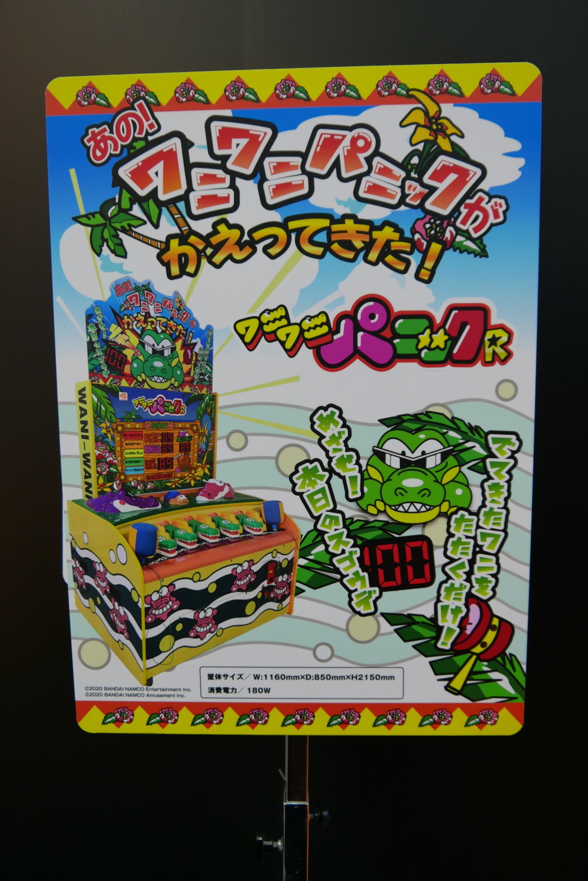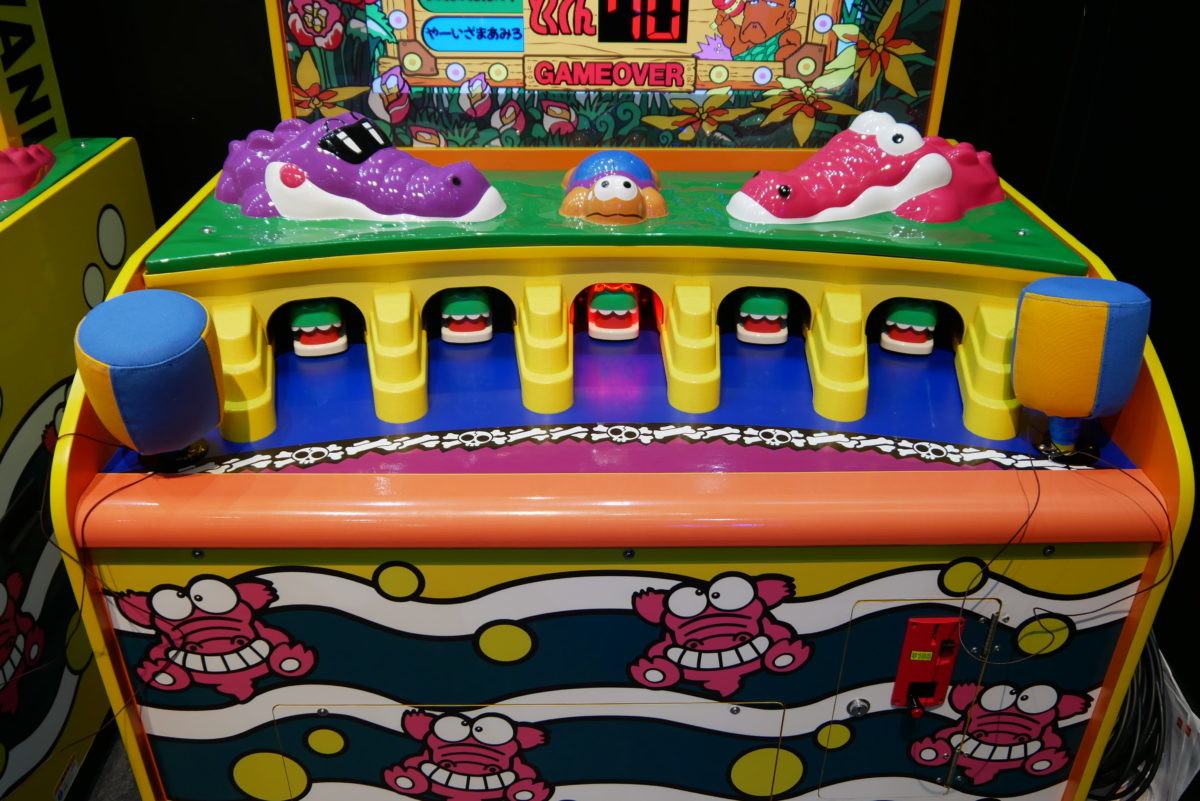 平成を代表するエレメカの傑作「ワニワニパニック」が、令和に登場! ワニワニパニックのシリーズは過去に何作かリリースされていますが、今回は平成元年(1989年)リリースの“初代”ワニワニパニックが、31年の時を超えて帰って来ました。パッと見では31年前の筐体との違いがいまひとつわかりません。何が違うのか聞いてみたところ、まず、親子などでプレイするケースが多く見られたので、ハンマーを2つにしています。