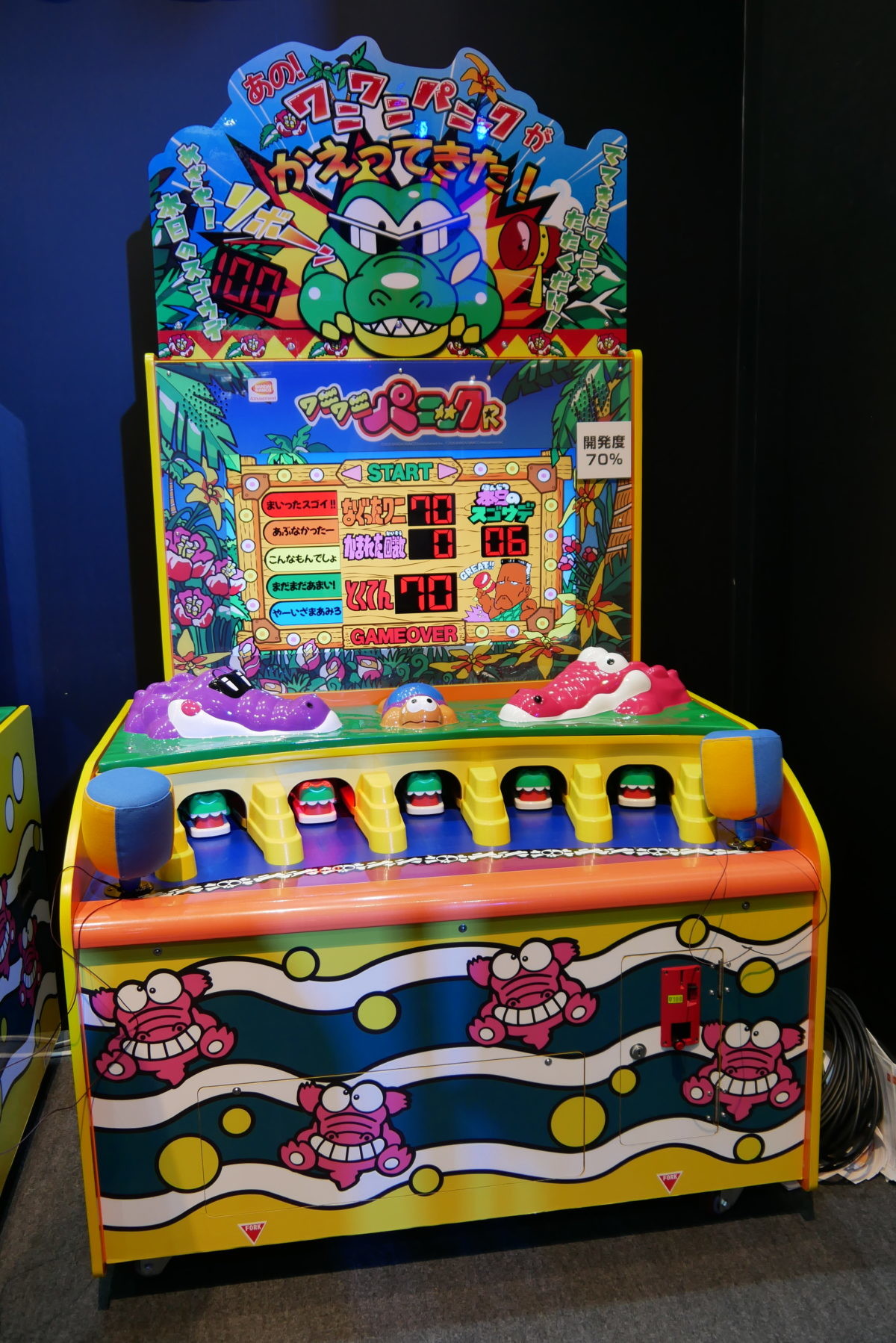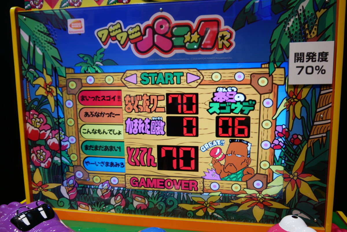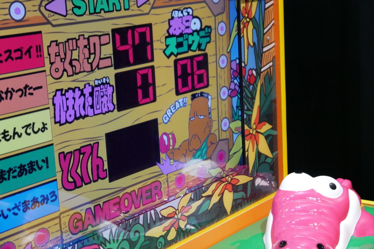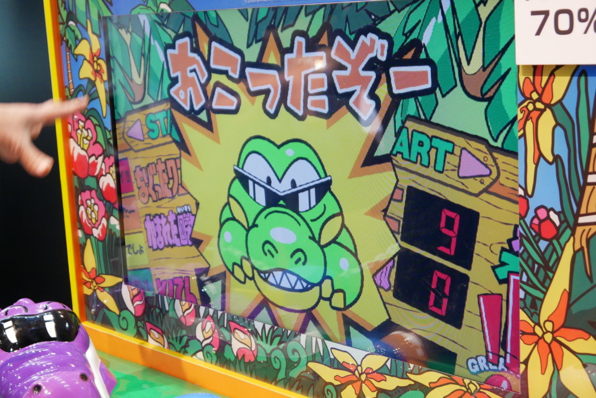 そして、中央のスコア表示部分が、32インチ液晶モニターになっています! これは気づきませんでした。しかも、ただ液晶にしただけでなく、画面右下のおじさんが動いたり、「もう、おこったぞ~!」でワニのカットインが入ったり、最終リザルト発表に合わせた演出も用意されています! この液晶演出、プレイヤーは(ワニばかり見てしまうので)正直気付きにくいかもしれませんが、“ギャラリー”(見ている側)のワクワク感はアップしそうですね! 稼働開始は6月の予定です。