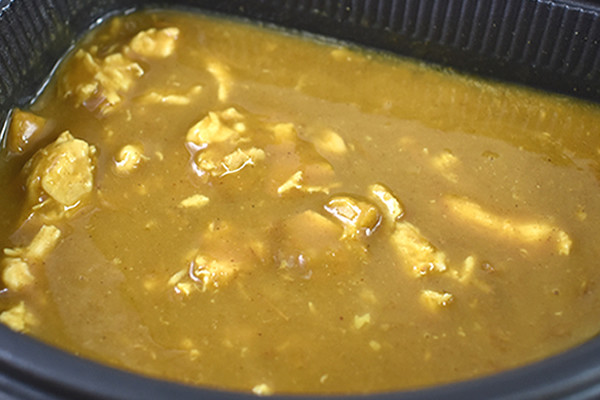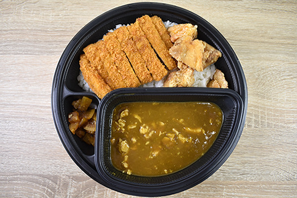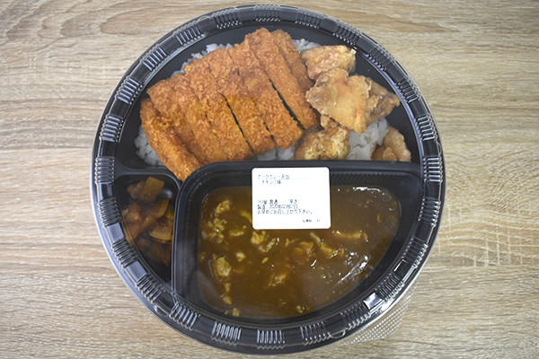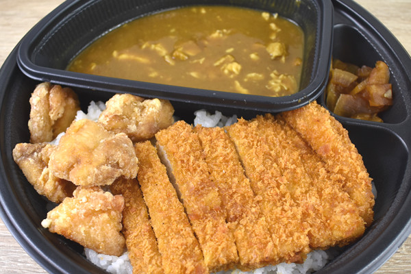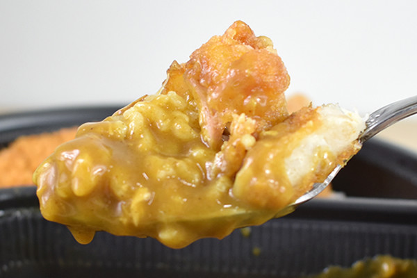ご飯の上には食べやすくカットされたチキンカツと、ひと口サイズのフライドチキンがトッピング。チキンにこみはカレーの中にたっぷり入っていました。フタを開けた瞬間、カレーとチキンのこうばしい香りが鼻腔を通過。食欲をそそられたところで、さっそく実食スタートです。