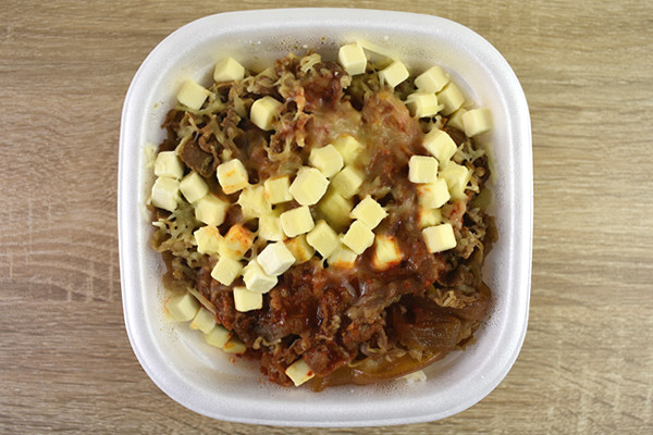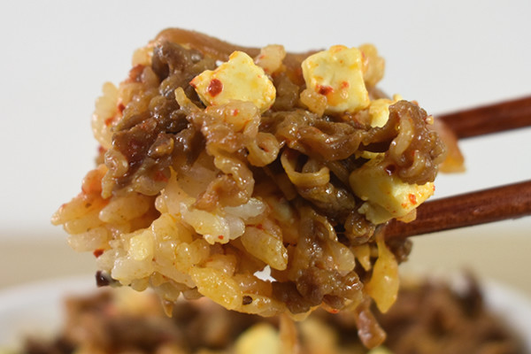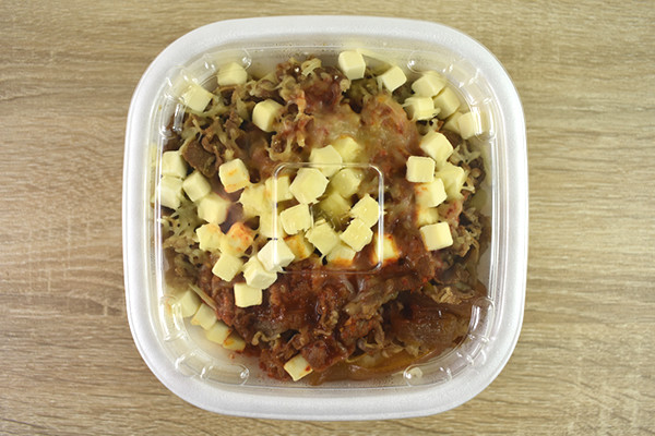チーズとアラビアータソースを組み合わせた辛口の牛丼です。アラビアータとは、唐辛子をきかせたトマトソースのこと。辛いもの好きから注目を集めているようで、ネット上からは「見た目に惹かれて買ってしまった」「めっちゃ辛そう! チーズとの相性も気になる」といった声が。アラビアータとチーズの味にスポットを当てながら、レビューを始めていきましょう。