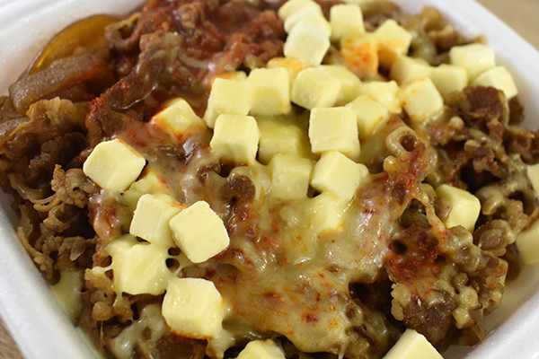 ヒリつく辛さとマッチしているのが2種類のチーズ。唐辛子の辛味とチーズの濃厚な口当たりが混ざり合い、いつの間にか辛さを忘れてしまいそうです。もちろん牛肉もジューシーで、食べ応えバツグン。もし辛いものが苦手な場合、トッピングで卵を乗せるといいかもしれません。