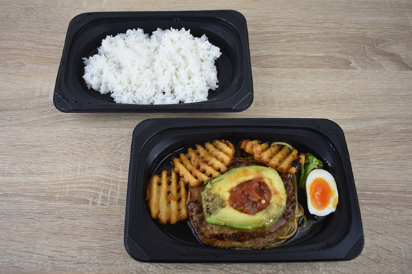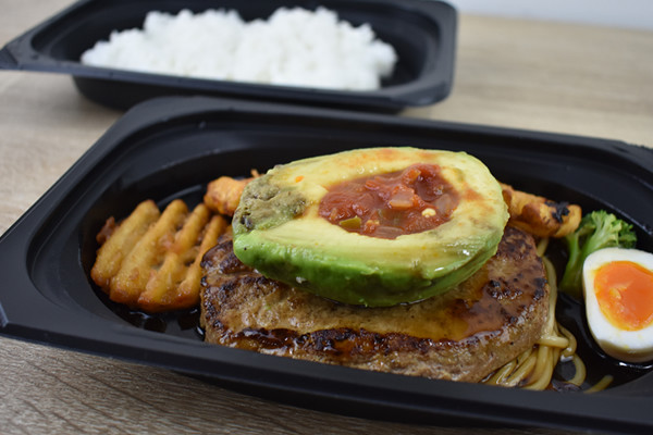 アボカドやハンバーグの他にも、ブロッコリーやワッフルみたいな形をしたポテトが。どちらも照り焼きソースがよく染み渡っているのがわかります。ちなみに同商品のライスは“普通盛り”でテイクアウト。普通盛りと大盛りでは値段が変わらないので、ガッツリ食べたい人は注文してみてくださいね。