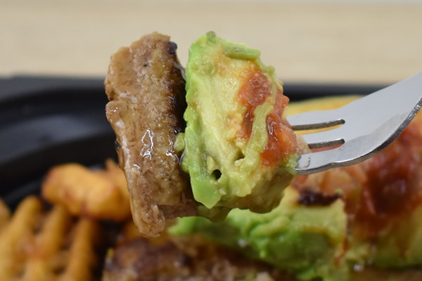 まずはハンバーグから食べてみると、少し噛むだけで肉汁がドバッと溢れてきました。隅々までこうばしく焼き上がっており、“肉感”をしっかり感じられます。照り焼きソースの甘さも丁度よく、子どもでもパクパクと食べられるかも。ハンバーグだけで十分に食べ応えバツグンでしたが、果たしてアボカドのお味はいかに…?