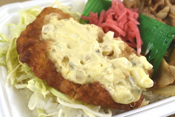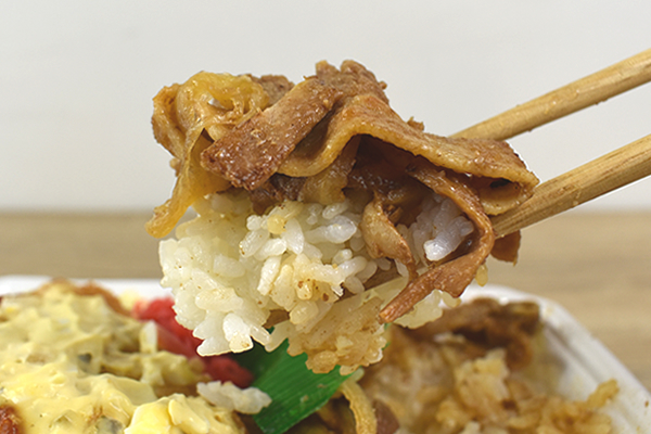 チキン南蛮としょうが焼きを豪快にトッピングした同商品。しょうが焼きは豚バラ肉を使っており、爽やかなしょうがの香りを漂わせています。タルタルがかかった鶏ムネ肉からは、ほのかに甘酸っぱい匂いを感じられました。