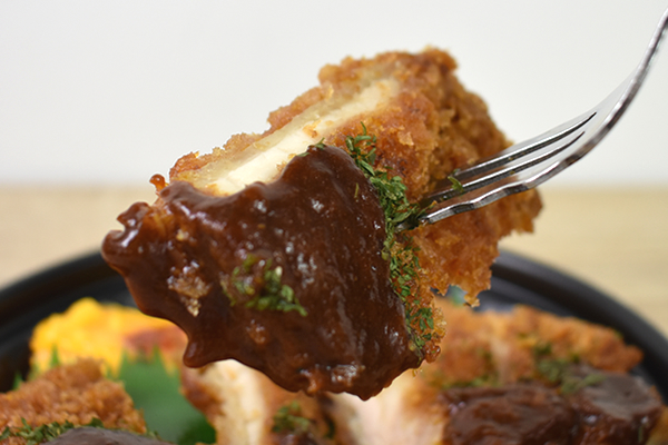 最初に、センターを陣取るチキンカツから食べてみます。ひと口いただくと、あまりにも予想外な食感に衝撃を受けました。衣はもちろんサクサクですが、中のチキンがとろけてしまうほどソフトな口当たりです。コク深いデミソースともしっかりマッチしているため、箸が止まらなくなりますよ。