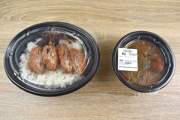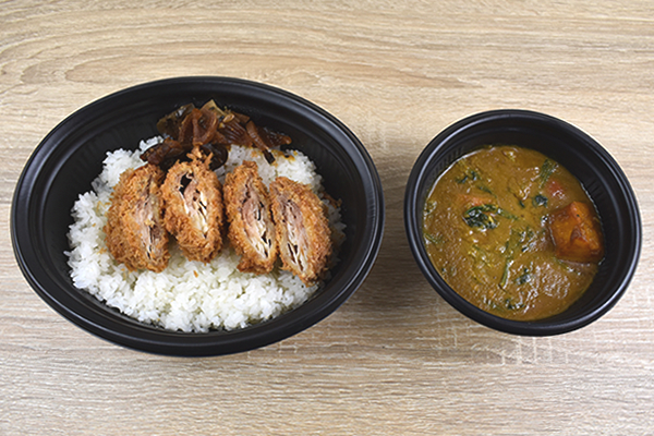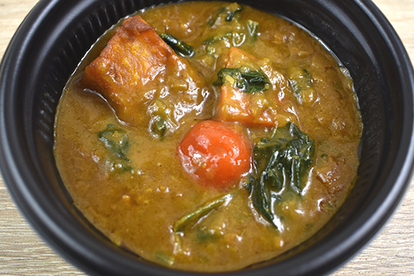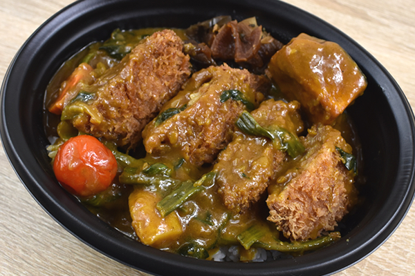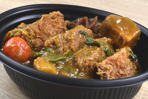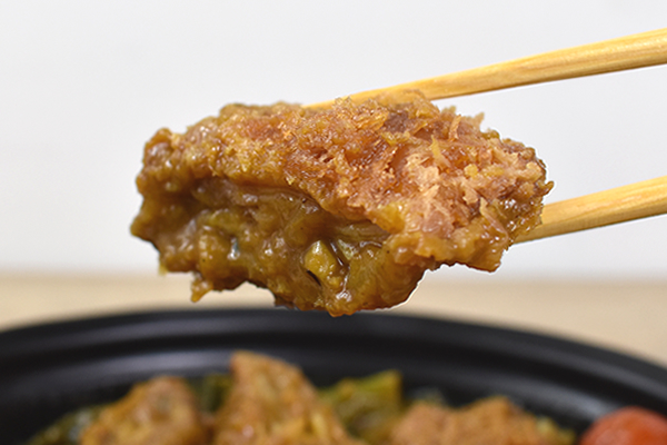 同商品はカレーとご飯が別々の容器に入っています。ご飯の上には薄切りのお肉を何枚も重ねた“ミルフィーユかつ”をドンッとトッピング。カレーのフタを開けてみると、食欲をそそるスパイスの香りが鼻を抜けていきました。ルーの中にカボチャやミニトマトも入っているので、かなりボリューミーな印象です。