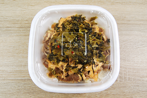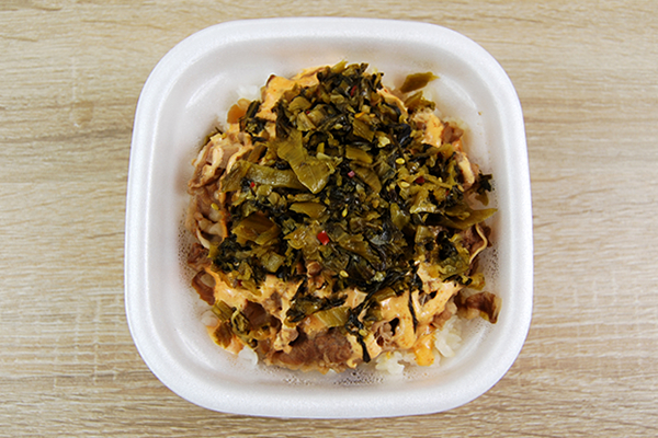 牛肉の上に細かく刻まれた“高菜”をたっぷりトッピングした同商品。フタを開けると、明太マヨの甘酸っぱい香りが湯気とともに漂ってきます。ご飯が見えなくなるまで具材を盛りつけているため、見た目はかなりボリューミー。クリーム色の明太マヨが牛肉の熱で溶け出しており、キラキラと輝いていました。