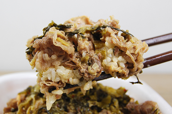 いざ、表面の高菜と牛肉から実食。細かく刻まれた高菜は、咀嚼するたびに程よい塩気とスパイシーな風味が感じられます。後からジワッと辛味が広がり、思わず水を飲んでしまうほど刺激的なテイスト。一方で牛肉は赤身と脂のバランスが絶妙です。玉ねぎが牛肉の臭みを見事に打ち消しているので、ジューシーな風味を存分に堪能できますよ。