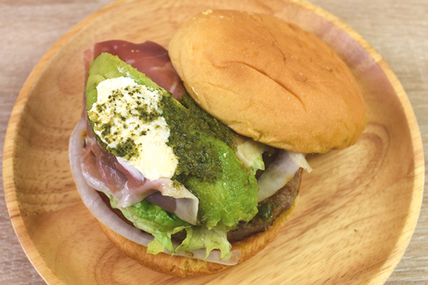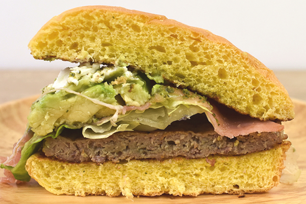 かぼちゃが入った“パンプキンバンズ”で新鮮な野菜をサンドした同商品。ハンバーガーの主役となるビーフパティの他に、スライスされたアボカドやプロシュートが挟まっています。全体の味を引き締めるのは、サワークリームとジェノバソース。袋を開けた瞬間、爽やかなバジルの香りが鼻の中を抜けていきますよ。